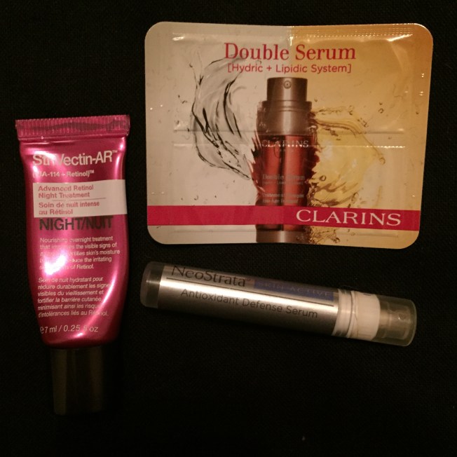 I could tell after this one-time-use packet that I needed the Clarins Double Serum in my life. I just loved the texture of it so much. It’s similar to the NeoStrata in that it’s like an oil, but the Clarins is less slippery and more moisturizing. There are two sides – two serums that are kept separate that mix together once you pump it out. I’m not sure why they are kept separate. Perhaps to retain the purity of each side? There’s a high possibility that’s not right, but it sounds scientific enough to be right. And also kind of romantic cuz that’s how my brain processes scientific information (i.e., not very scientifically; i.e., not very well AT ALL). This serum felt so soft going on, almost like velvet. It did take a bit to sink in, so I’d probably use less the next go-round, but once it absorbed my skin felt brand new. I could have completely skipped moisturizer because it felt that good. I mean, I didn’t because I love my 17-step routine, but I COULD IF I WANTED TO and that is the point.