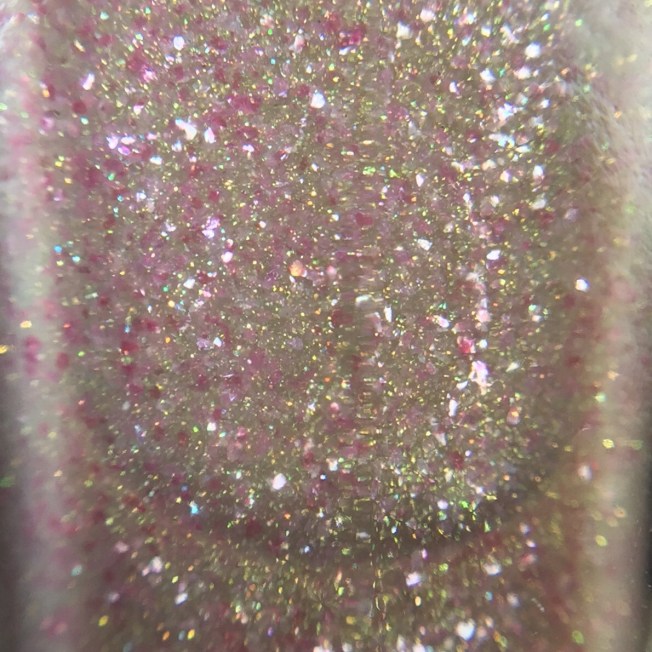 See, I told you! It also has a pink to gold shift at certain angles and these pretty copper and black holographic glitters. Here’s a (badly photographed) macro: