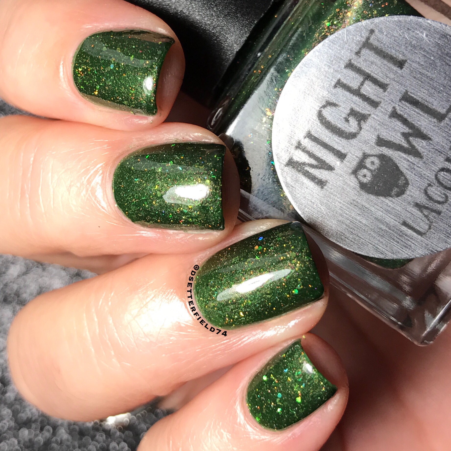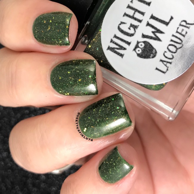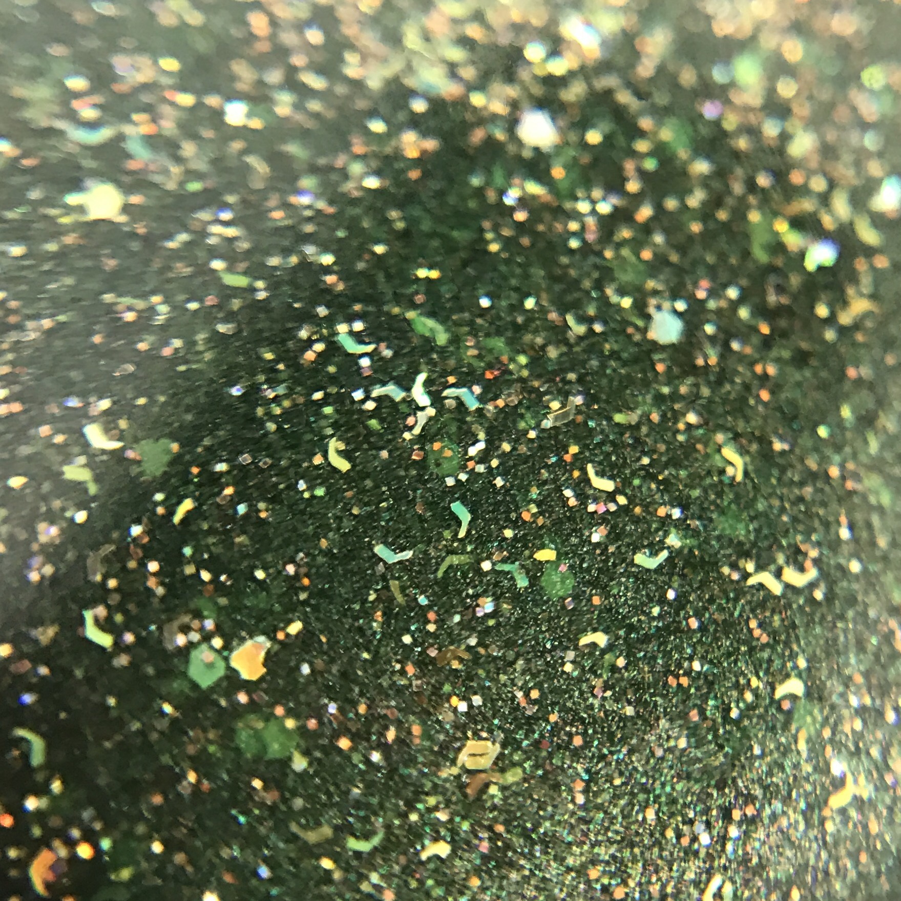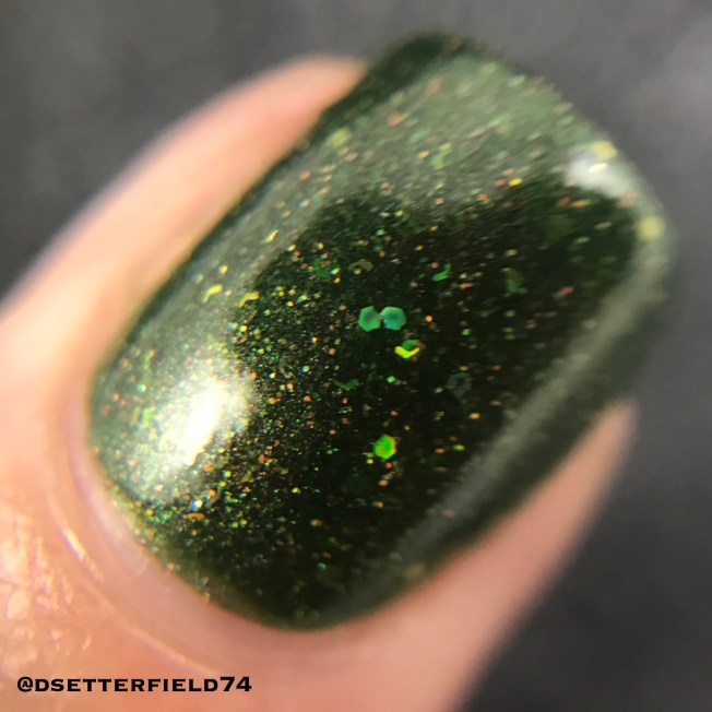 Inspired by the magic of the Forbidden Forest, it’s a deep shimmery green full of copper and gold holo glitter and gold holo shreds. I did this swatch in our airport hotel room so I’ve still got this polish on right now as we speak. And it’s held up really well. You know, with all the rock climbing and gold panning and trout fishing we’ve done since we got here.