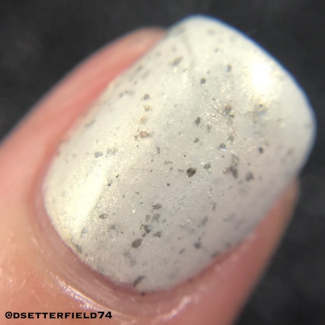 The polish itself is white but it’s loaded with a ton of gold shimmer. It’s really quite elegant. Throw in some gold and midnight flakies and you’re the belle of the ball. It’s so lovely!