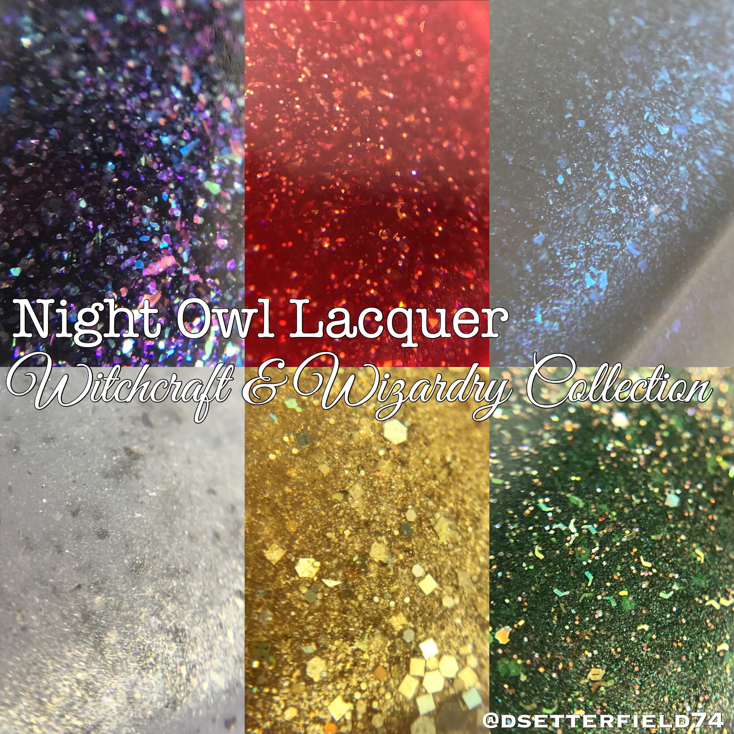 But you came here for the polish. I received this awesome Harry Potter-inspired collection by Night Owl Lacquer called Witchcraft & Wizardry. Look how pretty they all are: