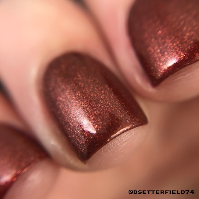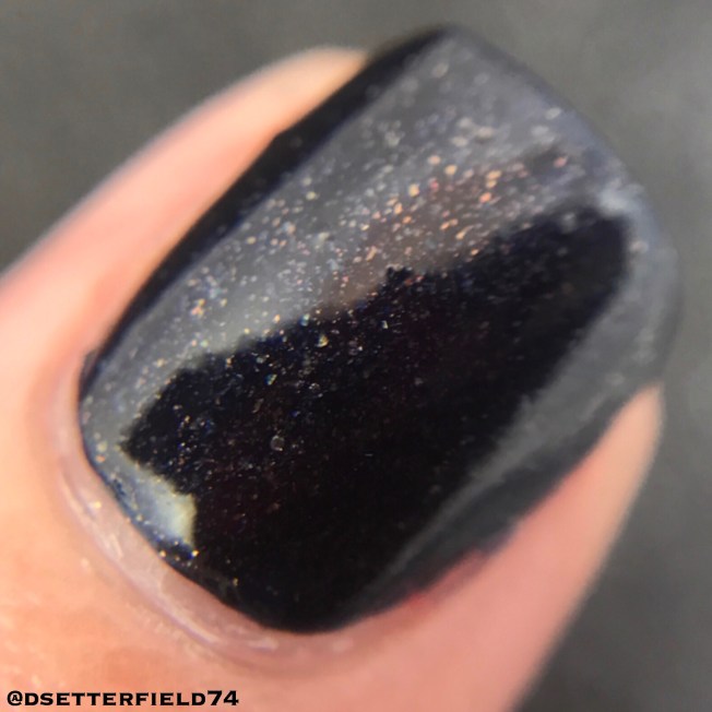 So this polish is a dark navy blue with copper flakies in it. I applied two coats even though this one didn’t really need it. It was basically a one coater, which I’m sure a lot of you will appreciate. Not me, cuz I can polish for 17 hours straight and never blink an eye (unless someone puts a Starbucks in my face), but I’m sure all the rest of you are normal human beings.