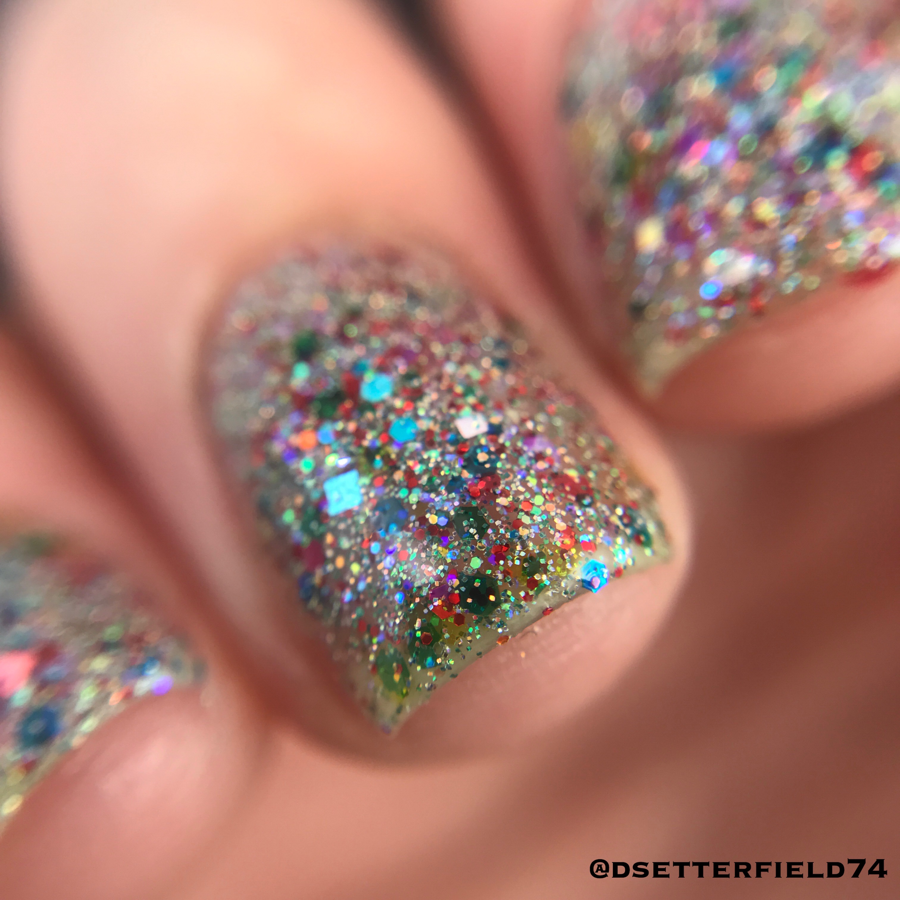 This may be considered a glitter topper because it’s sheer enough, but I applied about three coats on top of my naked nails. Full of silver, red and green holo glitters, holographic rainbow glitter, crystal rainbow glitter and rainbow iridescent glitter. You need this just for the amount of effort that’s in here. That’s four kinds of glitter, people. GET ON IT.
