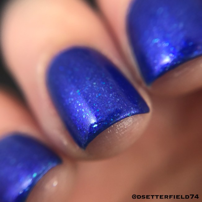Goodness, that’s pretty. That blurple base is to die for. Look closely in that macro and you can see my meager attempt at capturing its bright violet shimmer. However, the iridescent glitter is like BAM! and the white micro flakies are straight up seducing me.