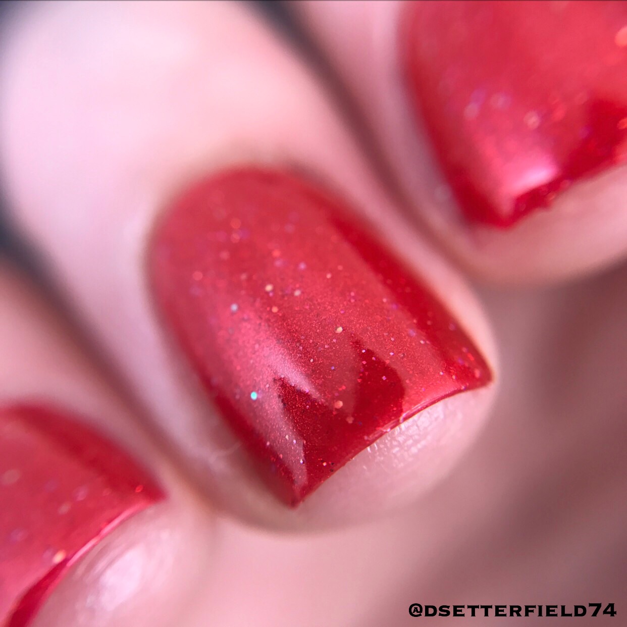 This is a bright red shimmering shade with red holographic glitter and green/gold iridescent glitter. So so pretty. Two coats, smooth like butter. And I love it so much. Can’t wait to stick my fingers in people’s faces with this one on. Completely and 100 percent-ly socially acceptable.