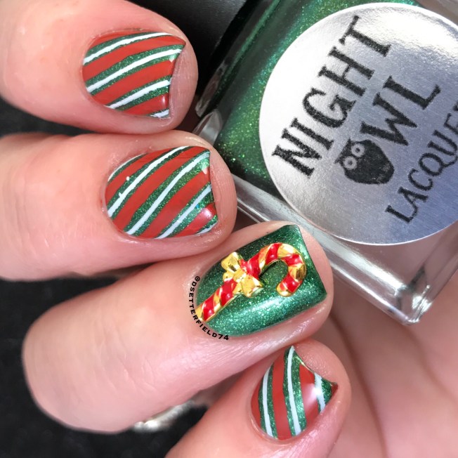 Added some fun candy cane stripes using the Lina Feeling Shapely 01 plate, plus I had this cute little charm from the Cosette Nail Shop that just went perfect. If I do say so. And I do. I did! I said so.