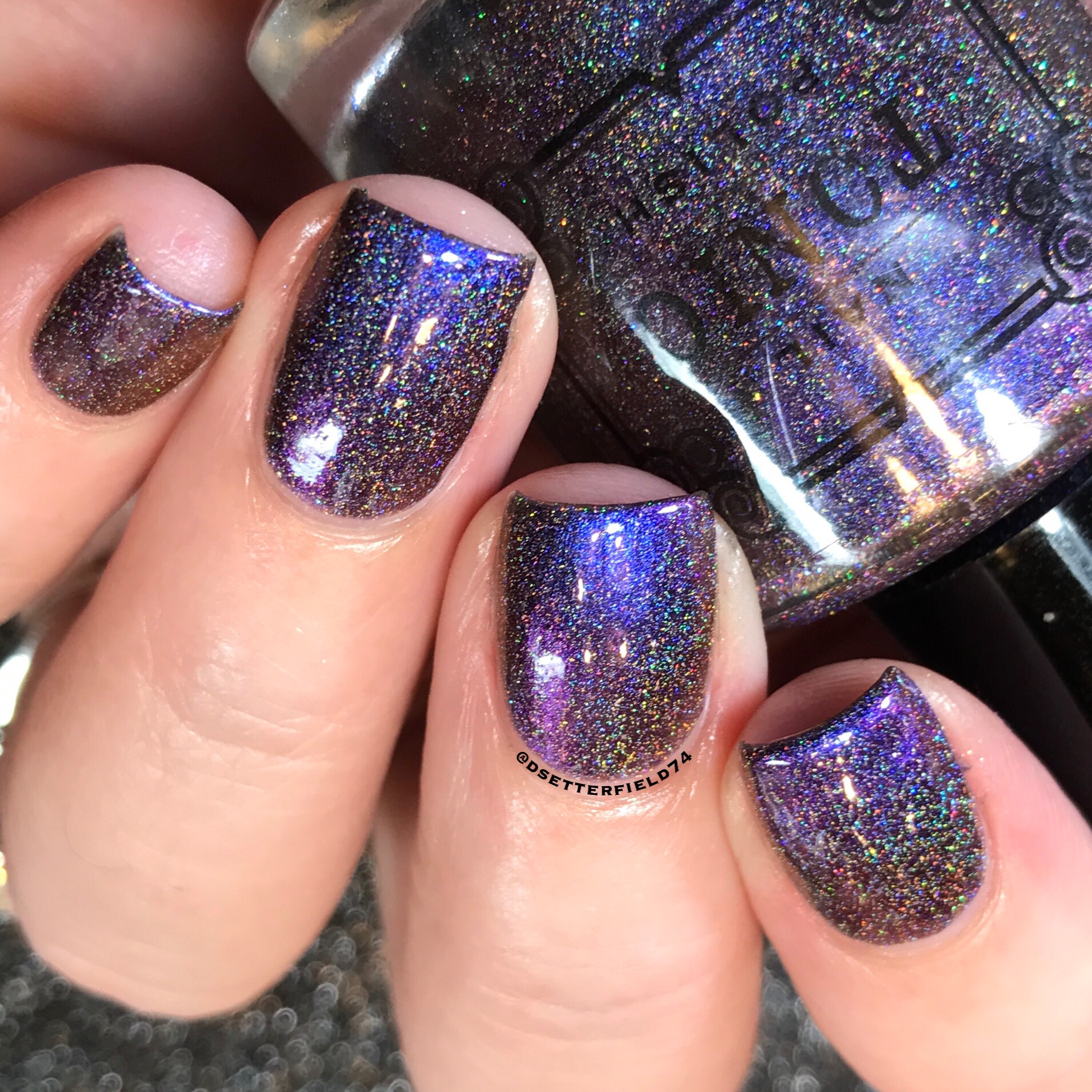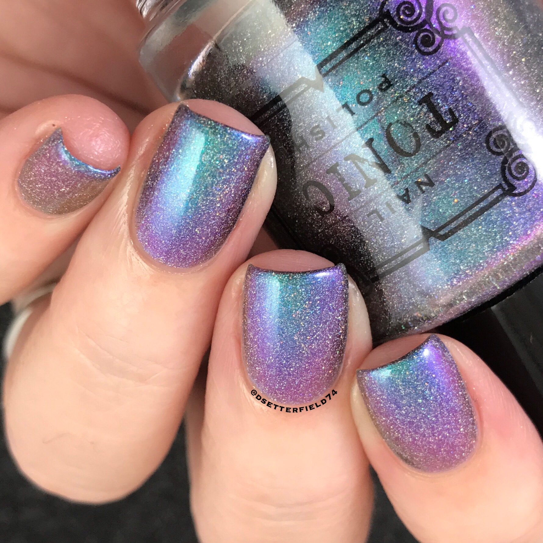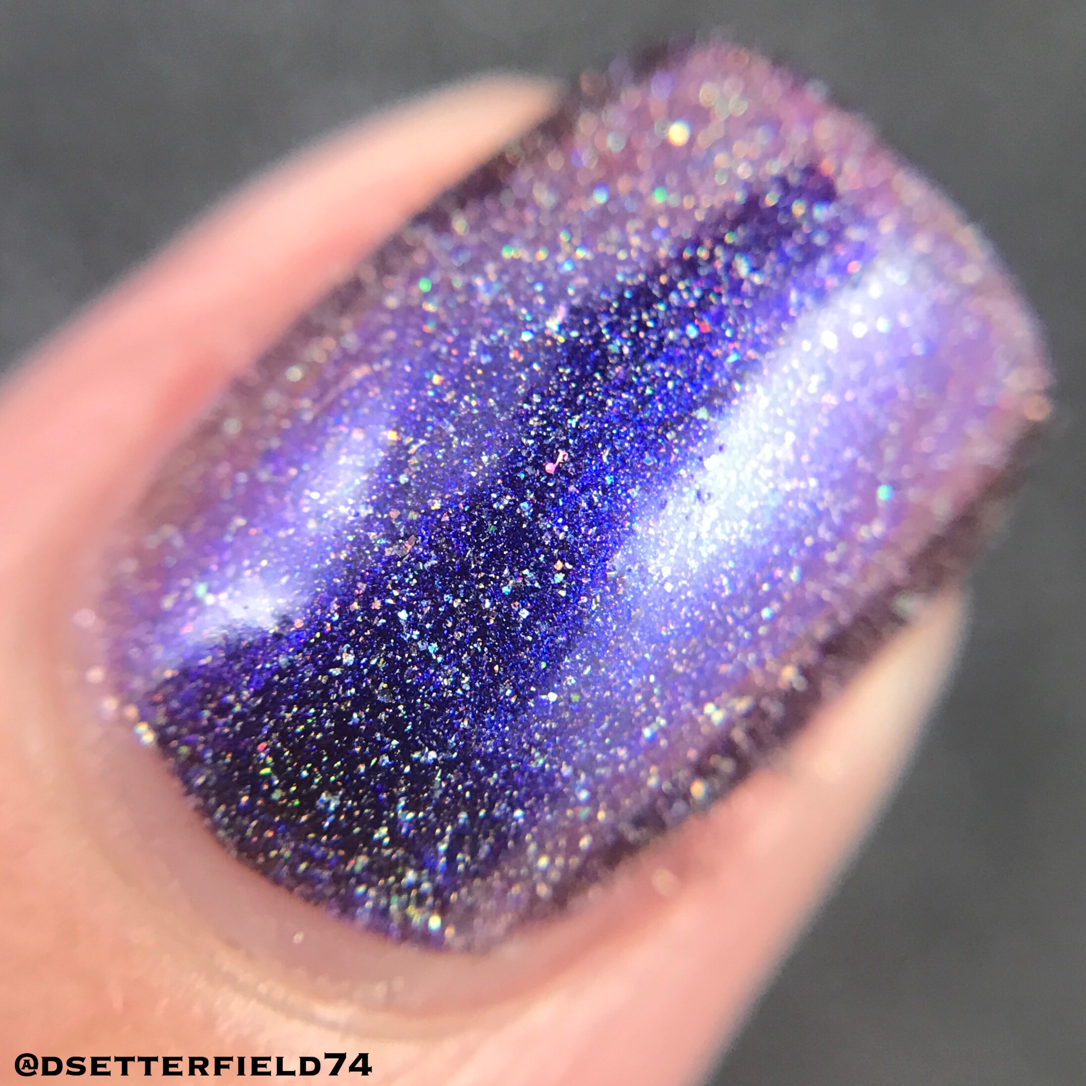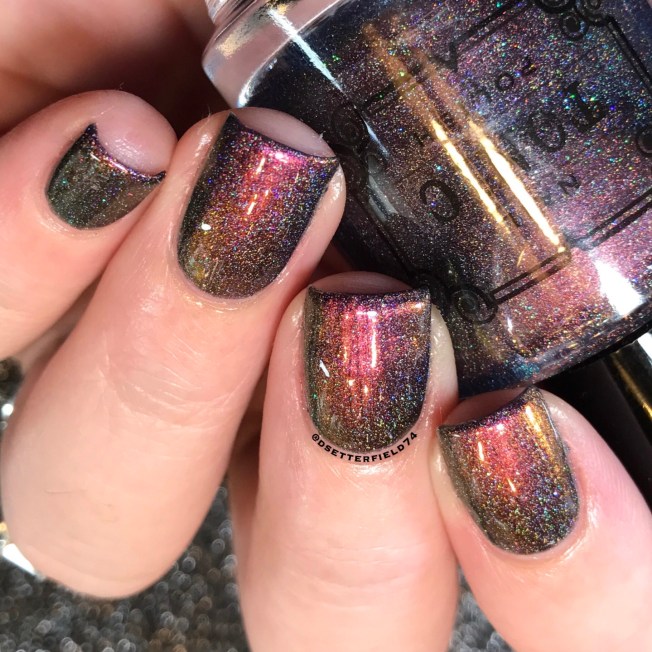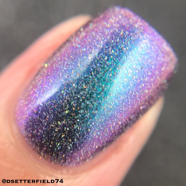 Lindsey used the shiftiest pigment she could find – and the result is mindblowing. We’ve got it shifting through the entire rainbow, from green to blue, purple, red, peach, gold and back to green again. Add more scattered holo and micro glitter, and you might as well just lay down and faint for a second.