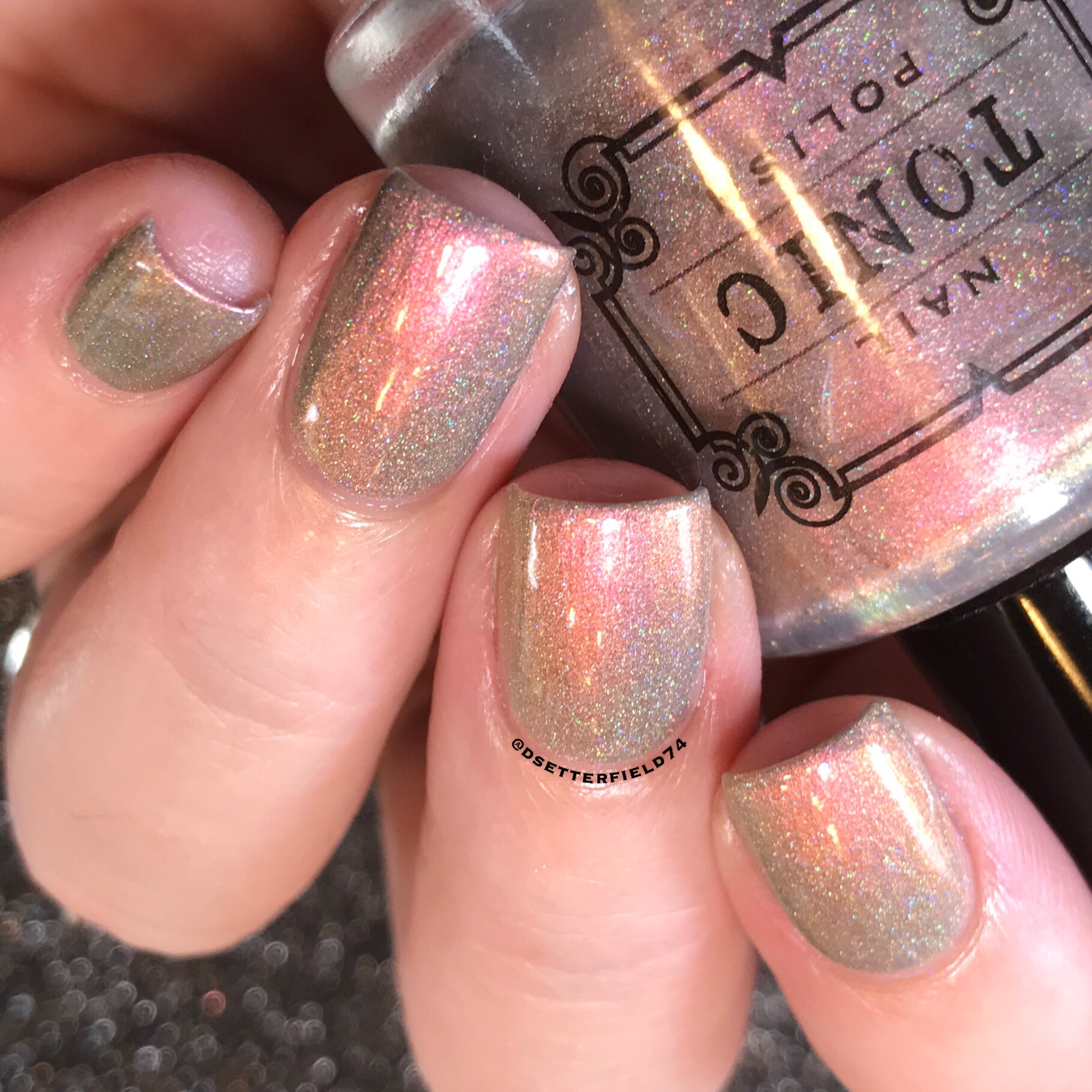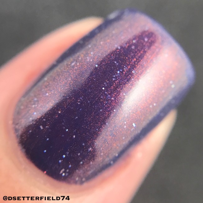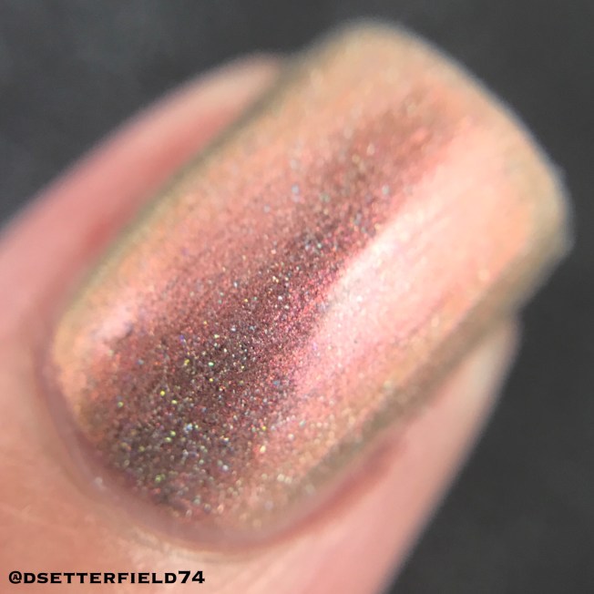Alright. Now it’s just getting ridiculous. How fabulous does this look under the lamps? This is a red, pink, orange, and gold shifting multichrome with a blue/purple shadow. More holo. More glitter. More fainting.