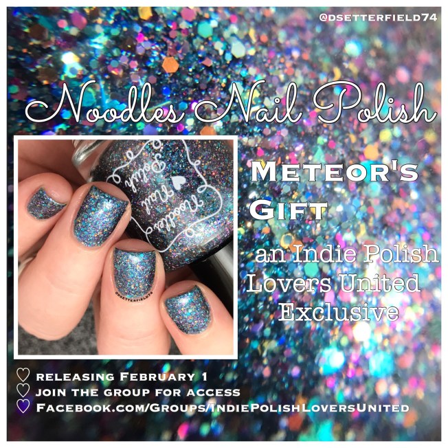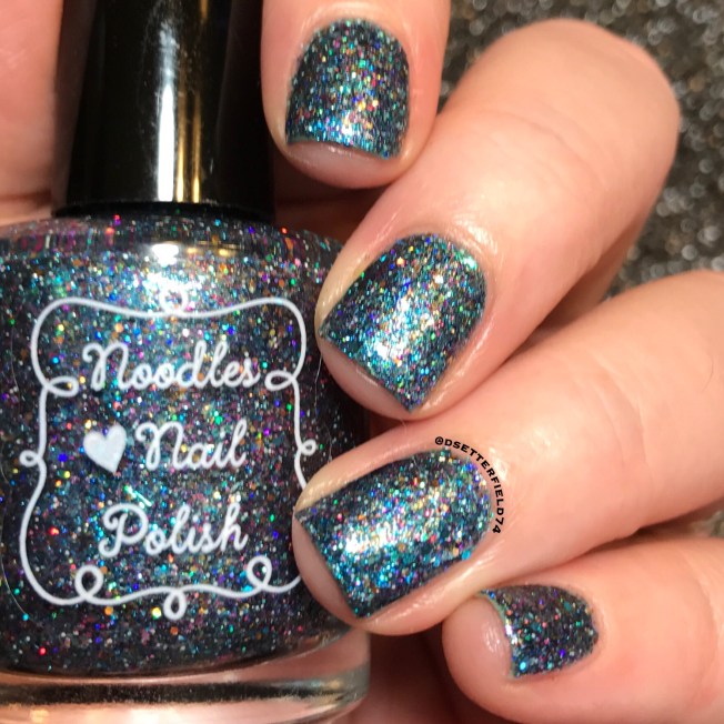 So while I figure out a way to get comfortable, let’s look at something pretty. I received this stunning glitter explosion from Noodles Nail Polish to share with you. Hold onto your britches, ladies, and get a good look at Meteor’s Gift:
