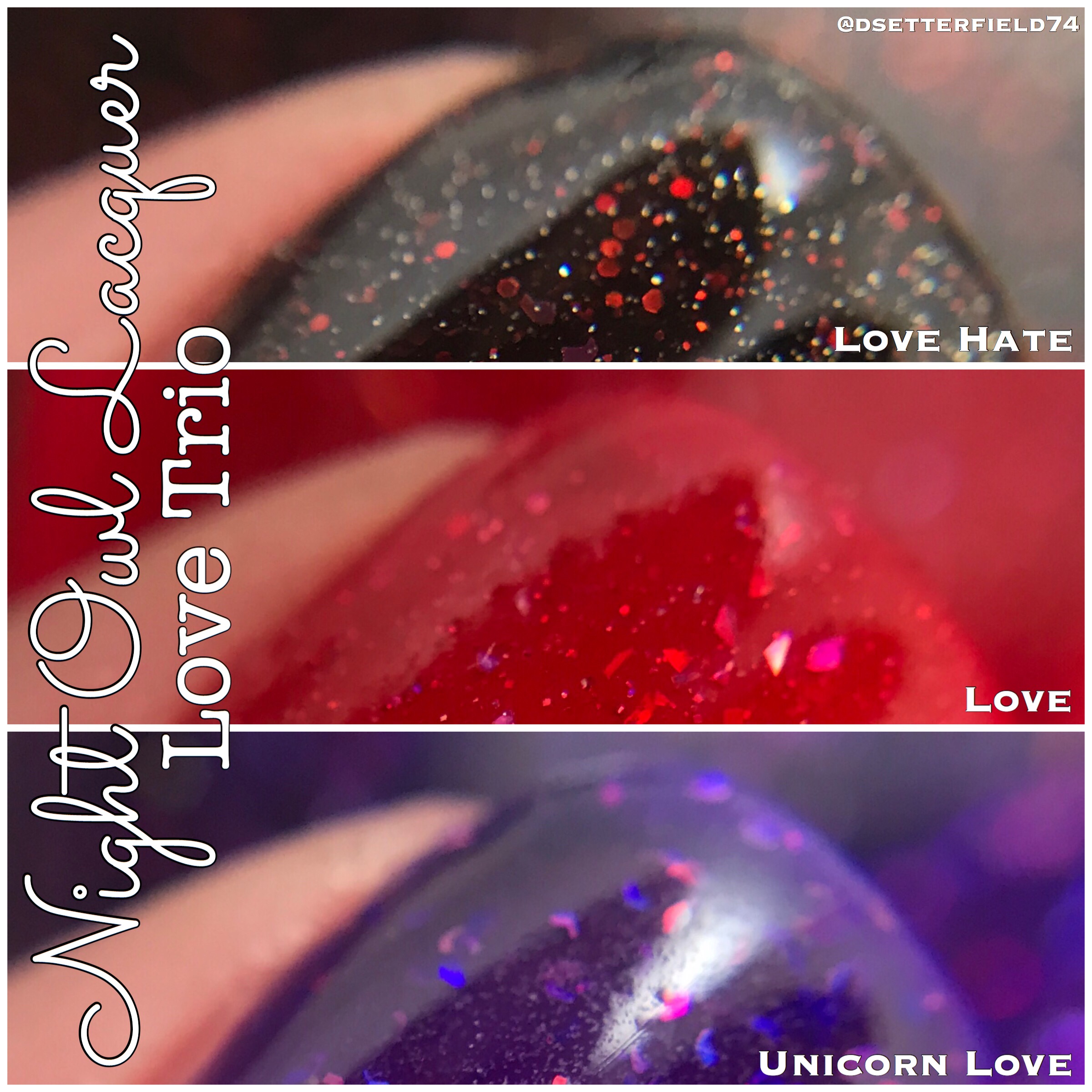 So while you contemplate that sad bit of news, let’s look at pretty things. Another awesome collection from Night Owl Lacquer coming your way today! I have their new Love Trio plus their very first Facebook group custom polish to show you. And a special little prize for those who read all the way to the bottom. Get ready! Lesssss go!