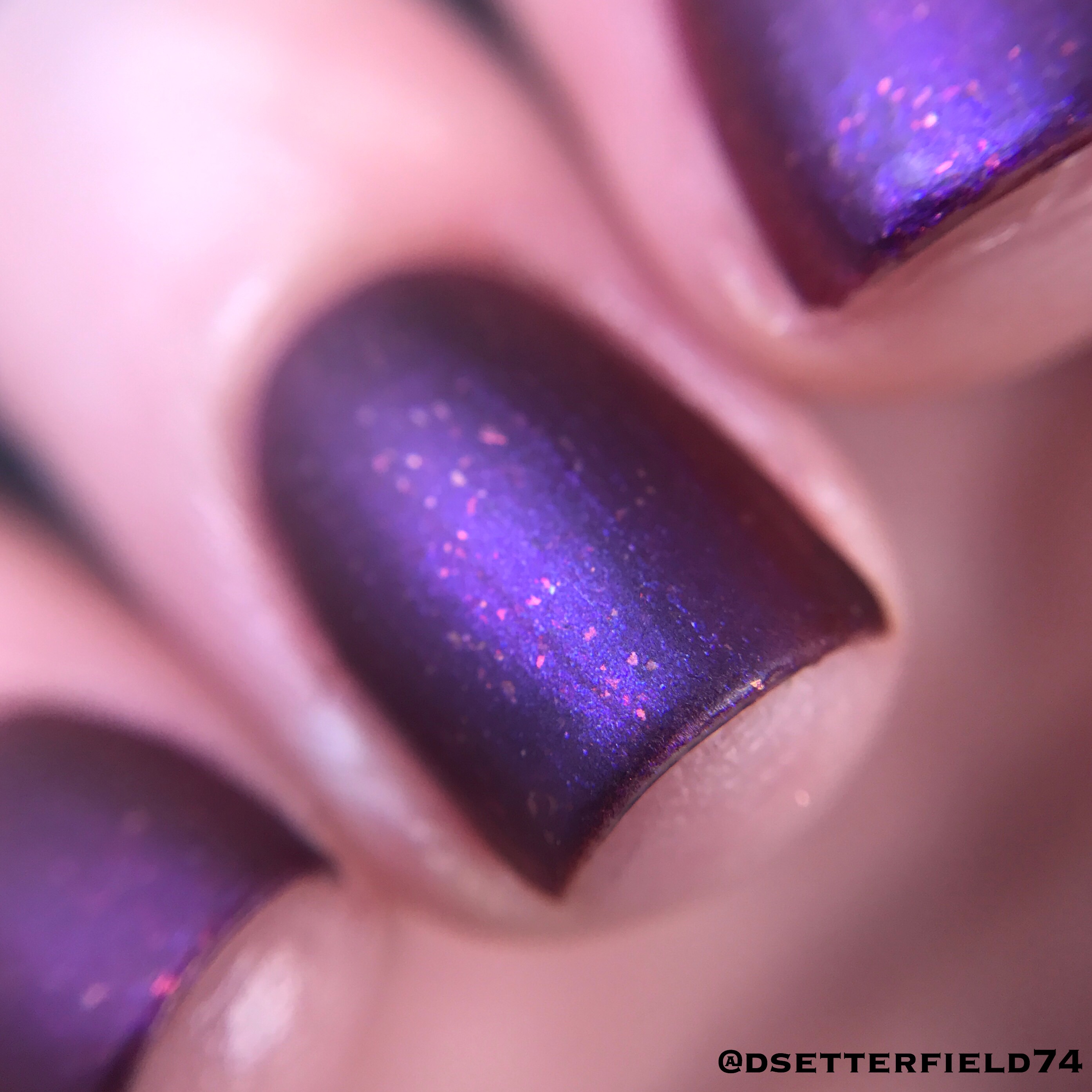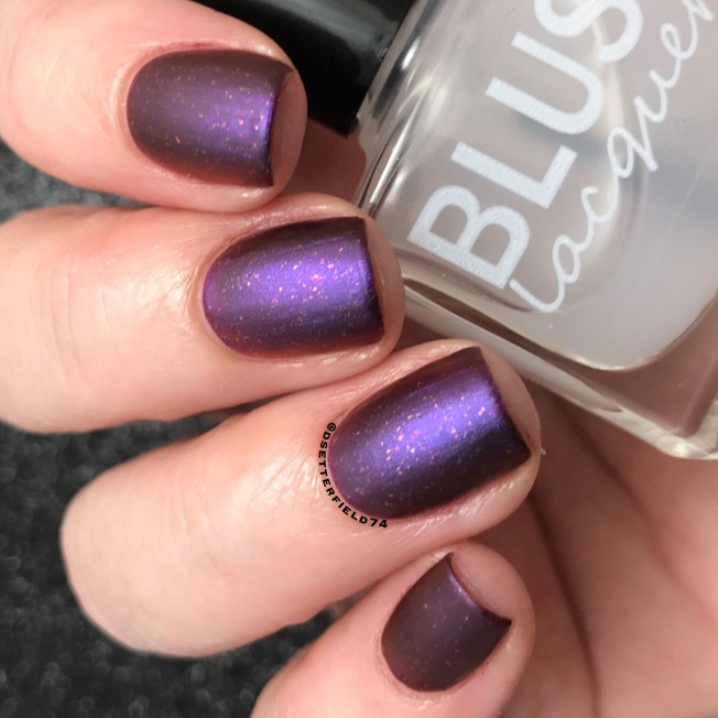 In my swatch, I’ve layered the top coat over one of Blush’s older polishes, Laugh-Borghini, because it’s full of these gold flakies and purple shimmer I thought would look lovely in a matte state.  And clearly, I was right.  Here’s proof: