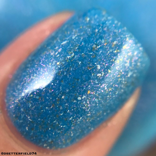 Since Polish Con will be held in New York City this round, Victoria has named this blue beauty Wonder Wheel, after the Coney Island ride of the same name.  It’s a sky blue base with pinkish-purple micro flakies, small gold flakies and holo flakies. Basically, flakies are everywhere. But we don’t argue cuz flakies make everything better. And prettier and skinnier, too, prolly.