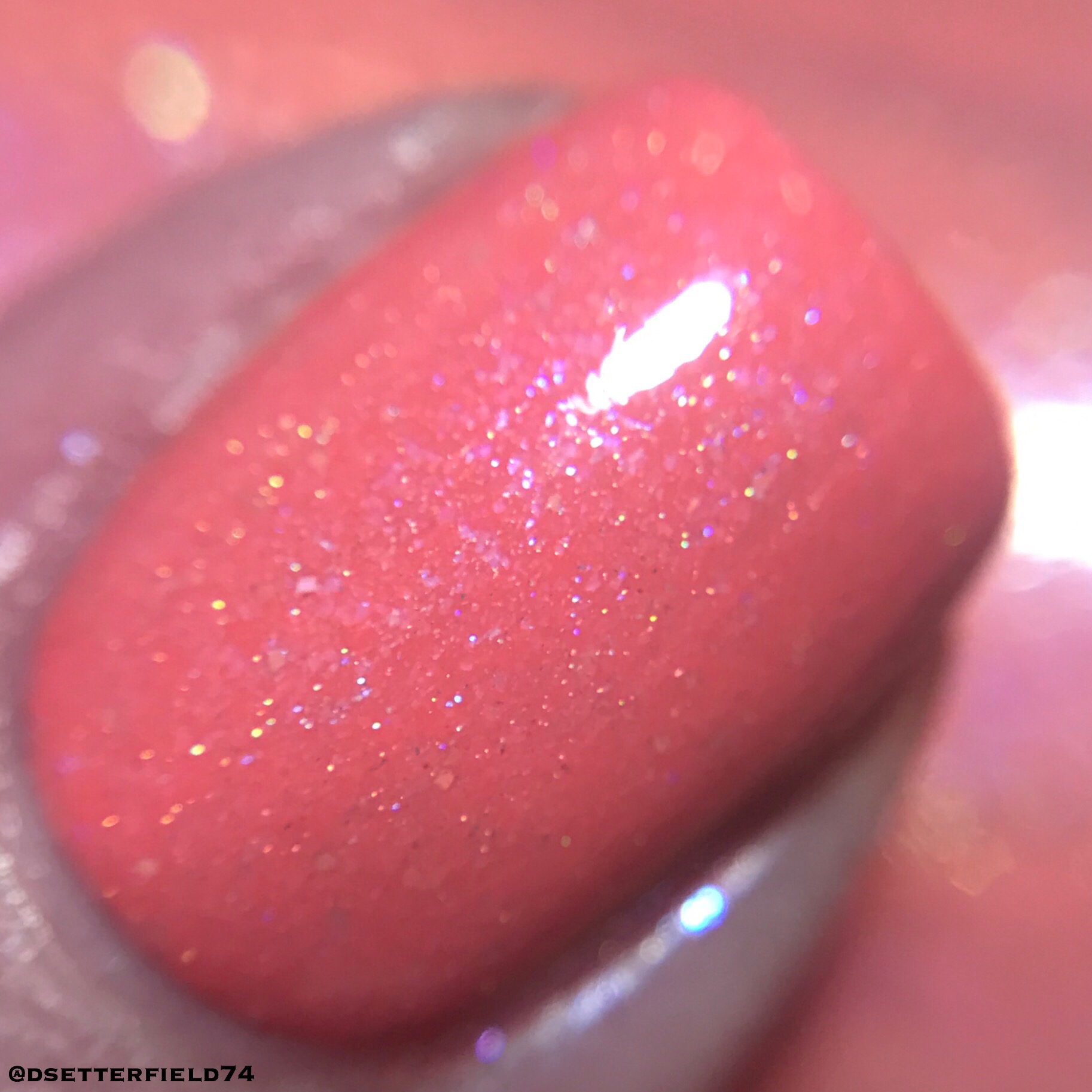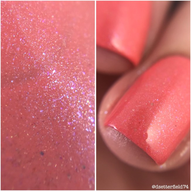 So this one is a light coral creme holographic with sparkles of silver holo microglitters and subtle purple and blue shimmers. It’s very springy and fresh and totally work appropriate and Queen of England-approved, you know, in case you two are having sandwiches later. As happens from time to time.