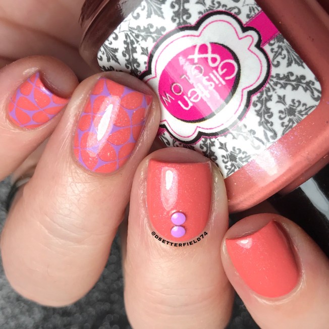 A pretty simple design, but thought I’d play off those purple shimmers by adding a bit of purple stamping. Kinda cute, yes? I mean, you’ve seen me do worse I’m certain of it. Cuz you’ve read this blog before.