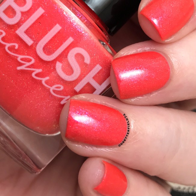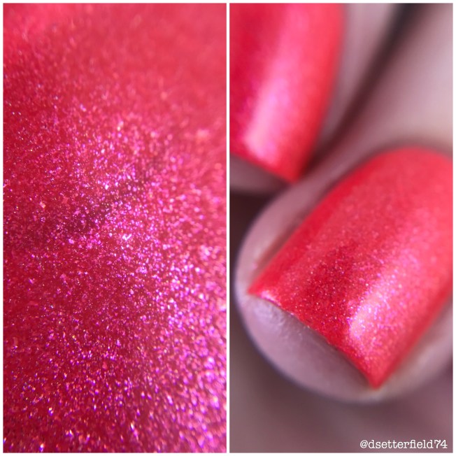 This one has a coral base with pink micro flakie shimmer and delicate linear holo. It’s so stunning, guys! The color is so bright, almost neon really. And application is sooooo smooth, it’s almost a Polish Mountain-type situation except I give up after just two coats cuz I’m not very good at goals.