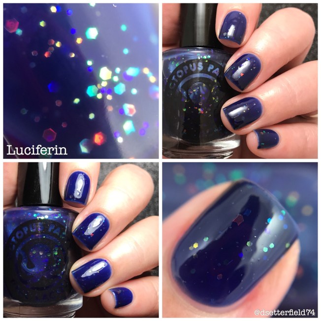 Again, this month’s theme is Under the Sea so Dave went all ROCKET SCIENCE for it and named his polish Luciferin after the light emitting enzyme/compound found in organisms that emit bioluminescence. Like this octopus thingy down below: