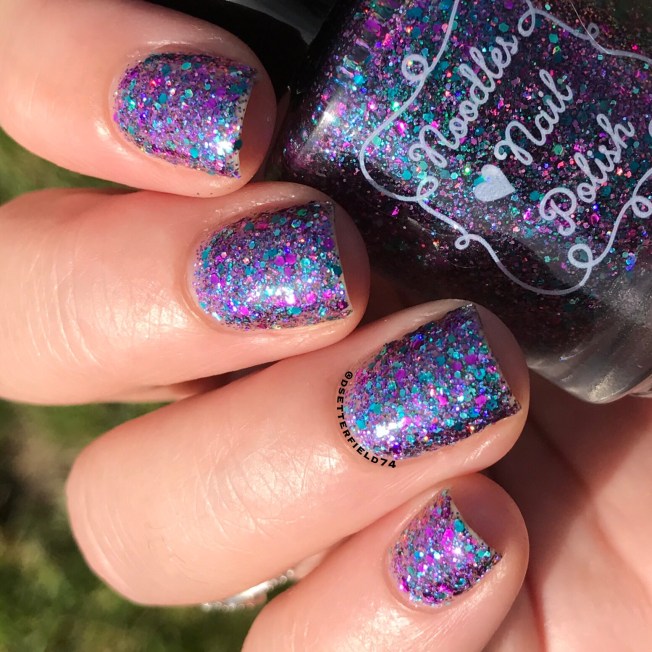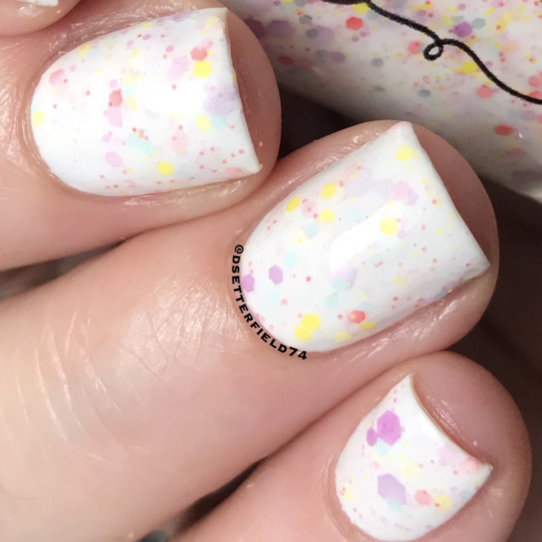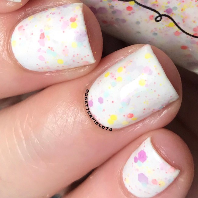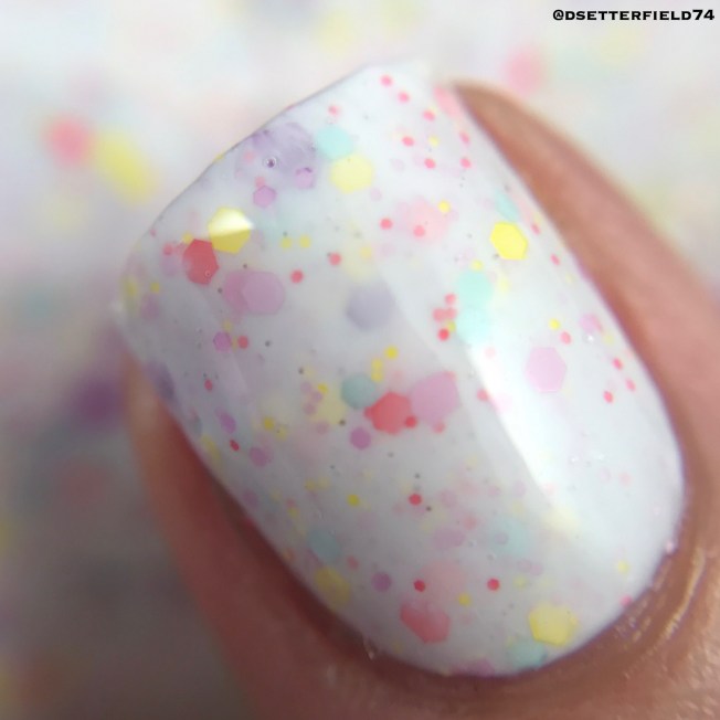 This one is a white crelly with yellow, light purple, blue and watermelon matte glitters. It’s the perfect summer day in a bottle! Well, somebody’s perfect summer day, I’m sure. Mine usually involves 27 blankets on the couch by the air conditioning. Cuz I don’t sweat like a lady, that’s why.