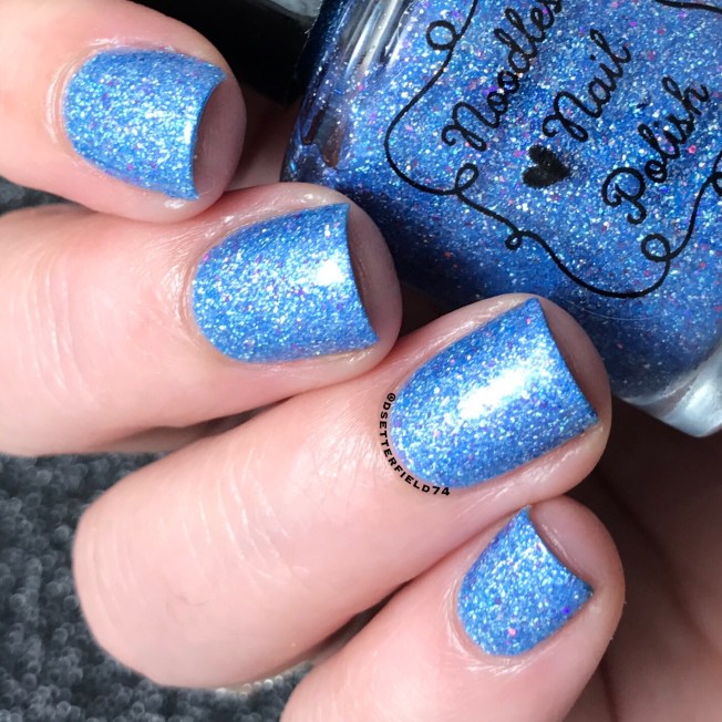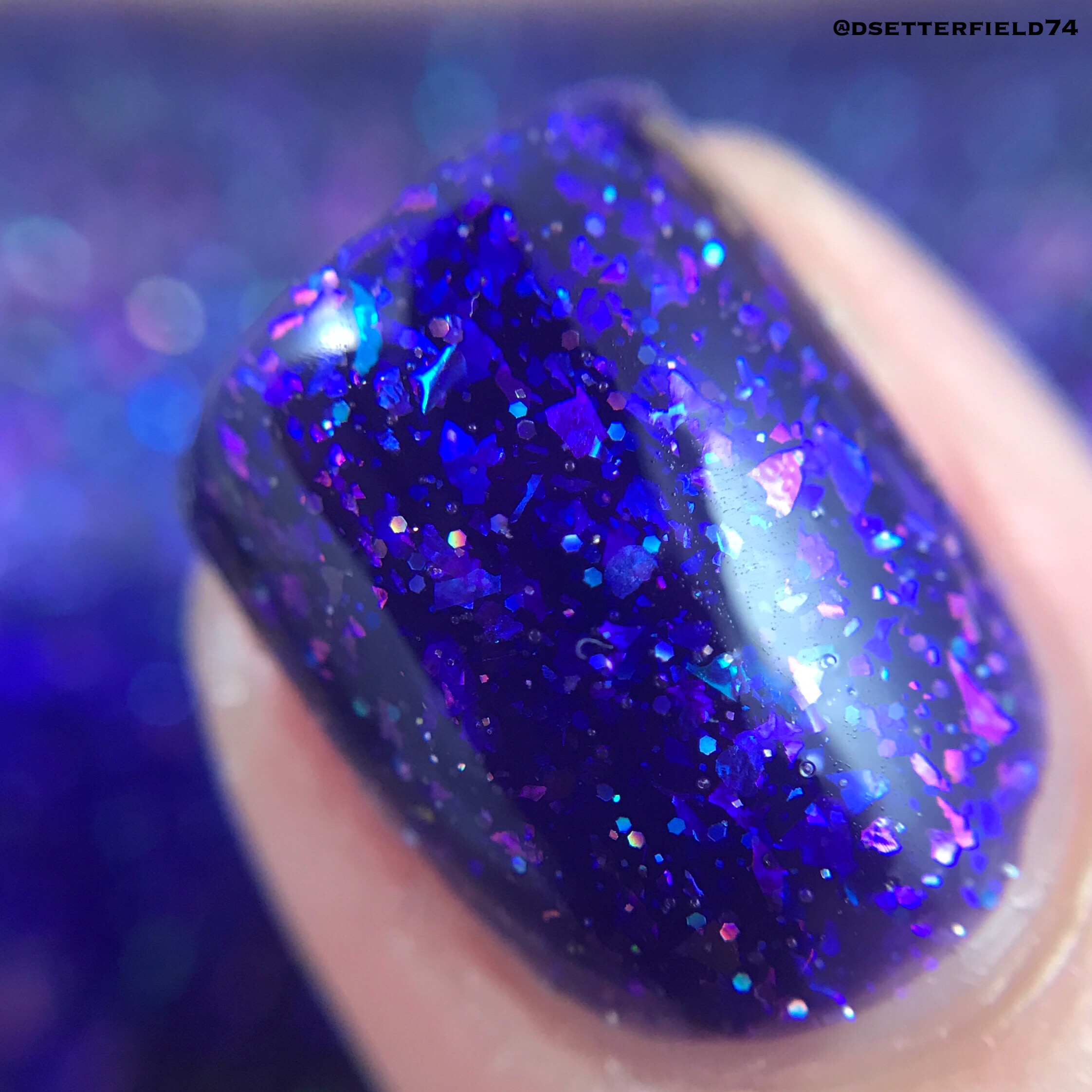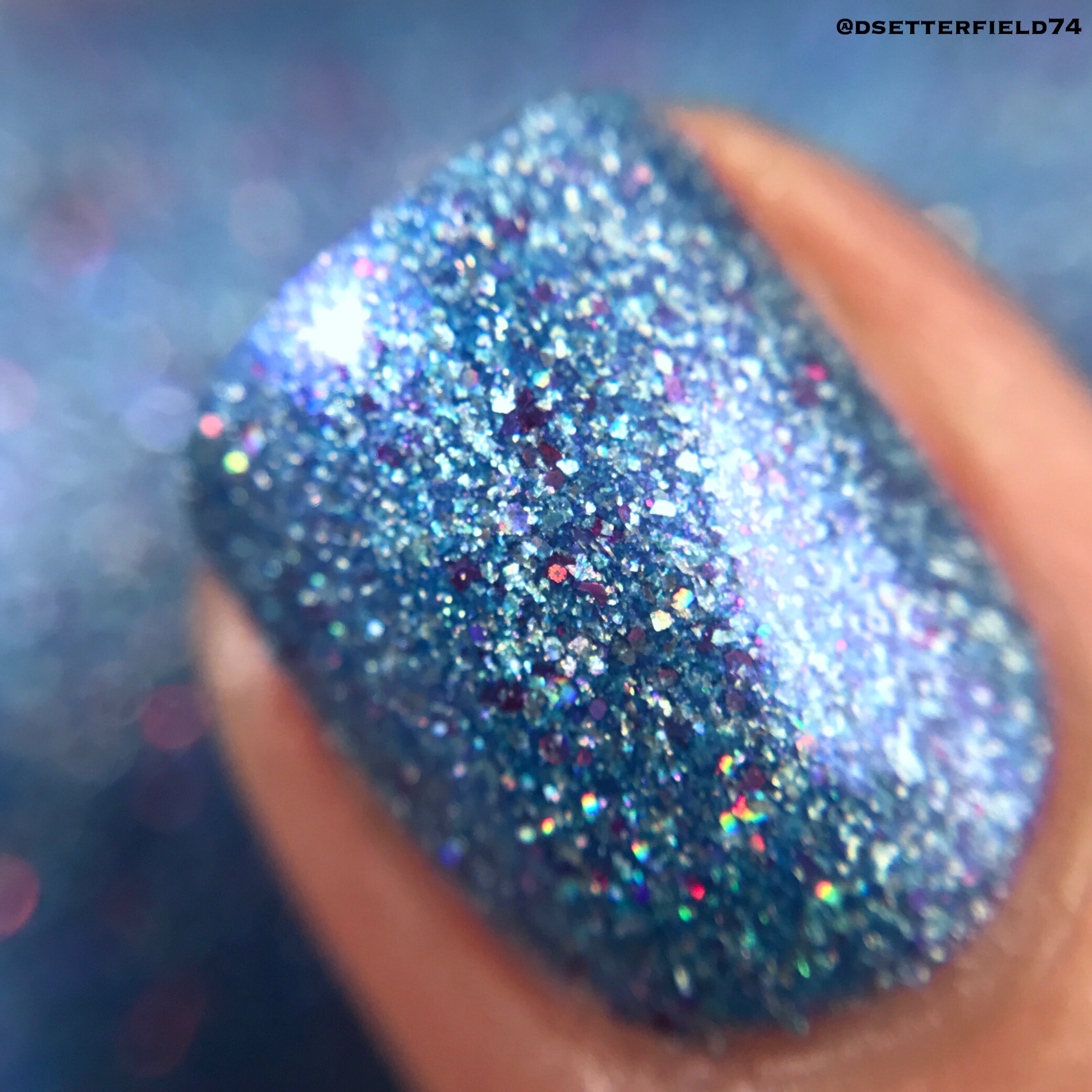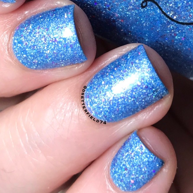 This one is a light blue crelly packed with silver holo flakies, silver and violet holo glitters and purple shimmer. My faaaaaavorite! It has the most amazingly fluid formula. Like, if I didn’t have so much blogging to do, I’d for sure have a Polish Mountain-type situation on my hands. So I just did two coats instead because occasionally I am responsible. I mean, Lazy, Level EXPERT had nothing to do with it. About 23% sure.