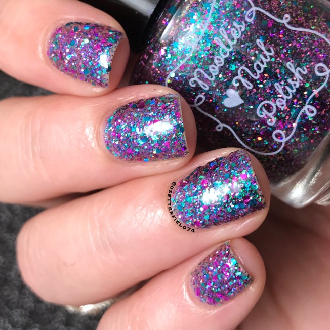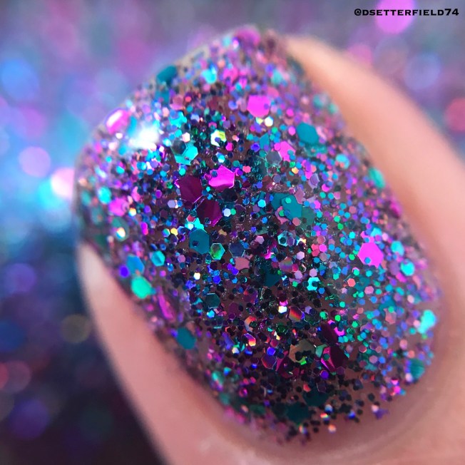 This one is a glitter topper full of green/blue/violet color shifting glitters as well as metallic and holographic turquoise and pink glitter. She’s a little braggy, let’s be honest. I mean, so much glitter, so much overachieve-y. But we lub her lots anyway.