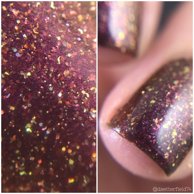 DESCRIPTION: A red jelly with orange/red flakies, gold holographic shreds and glitter, iridescent orange/green glitter, red shimmer, and red/gold/green and orange/pink/gold color shifting flakies