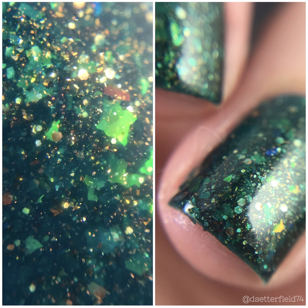 DESCRIPTION: A teal jelly with blue/green/copper color shifting flakies, copper and gold glitters and copper shimmer