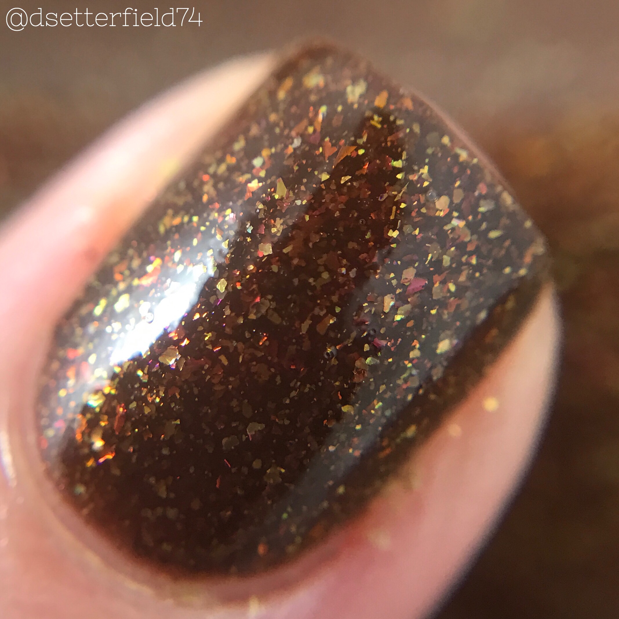 DESCRIPTION: An olive-toned brown crelly with scattered holographic and bronze and green shimmers