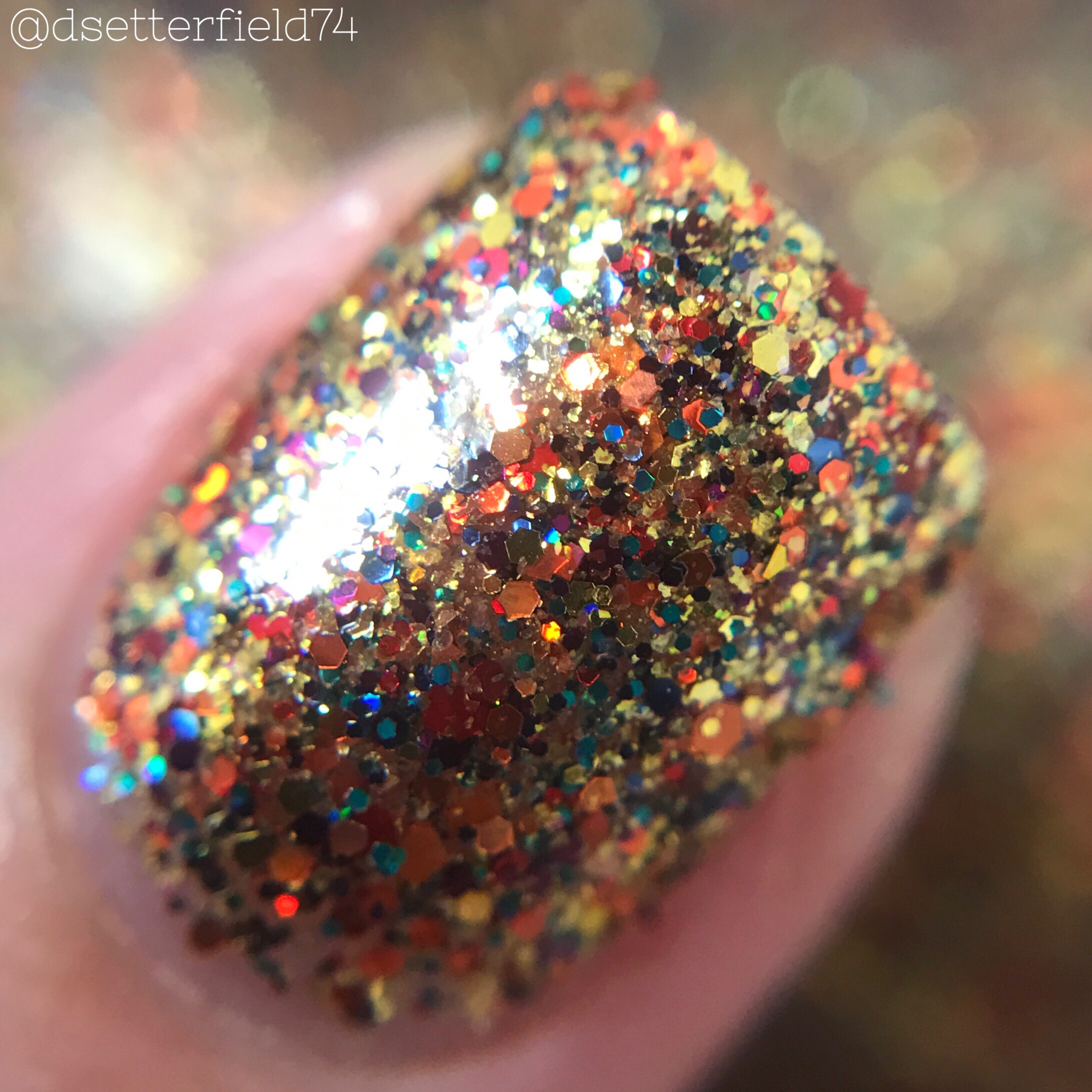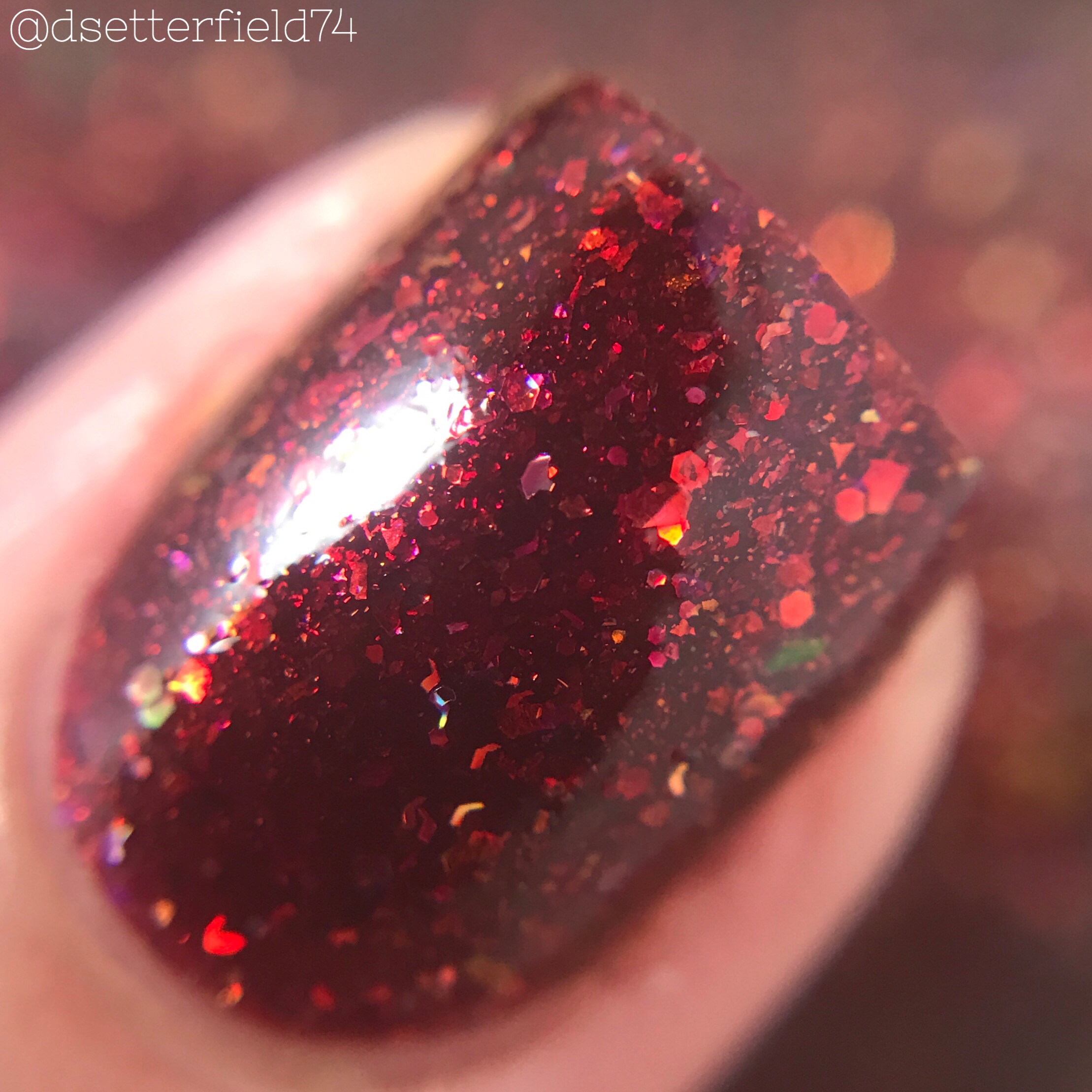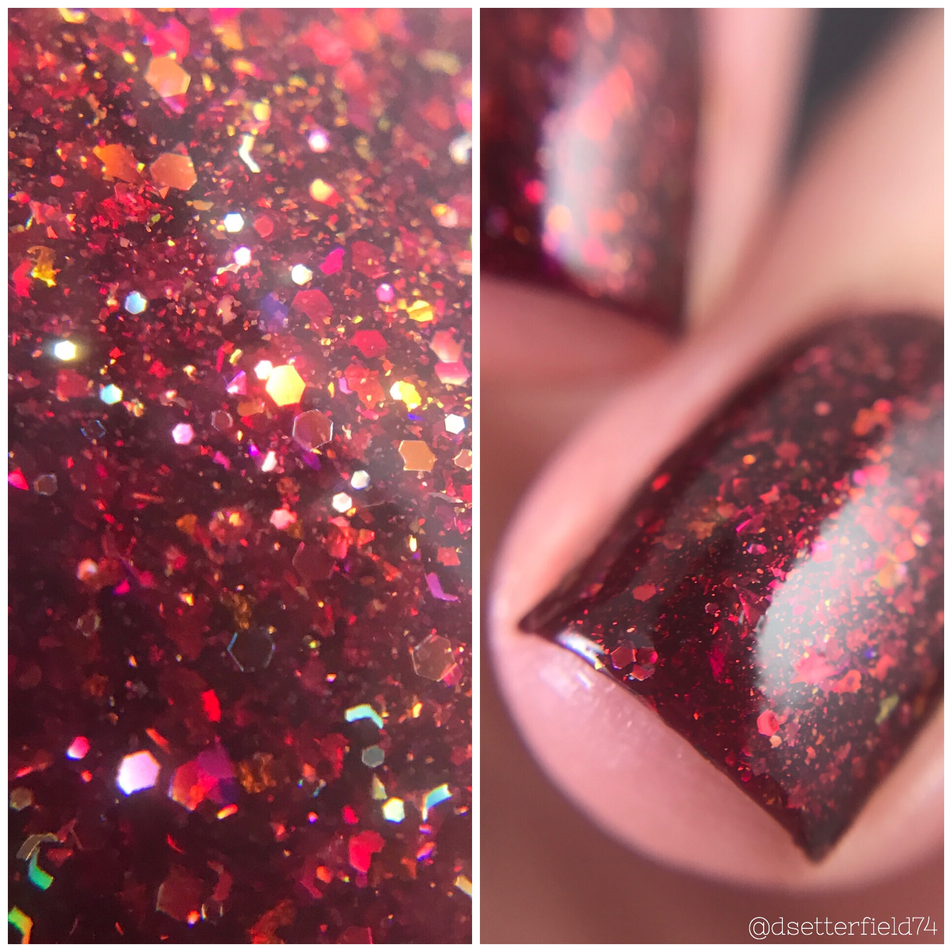 DESCRIPTION: A red jelly with orange/red flakies, gold holographic shreds and glitter, iridescent orange/green glitter, red shimmer, and red/gold/green and orange/pink/gold color shifting flakies