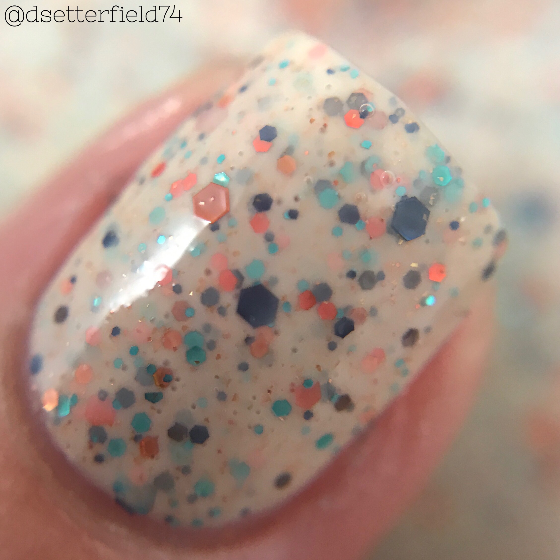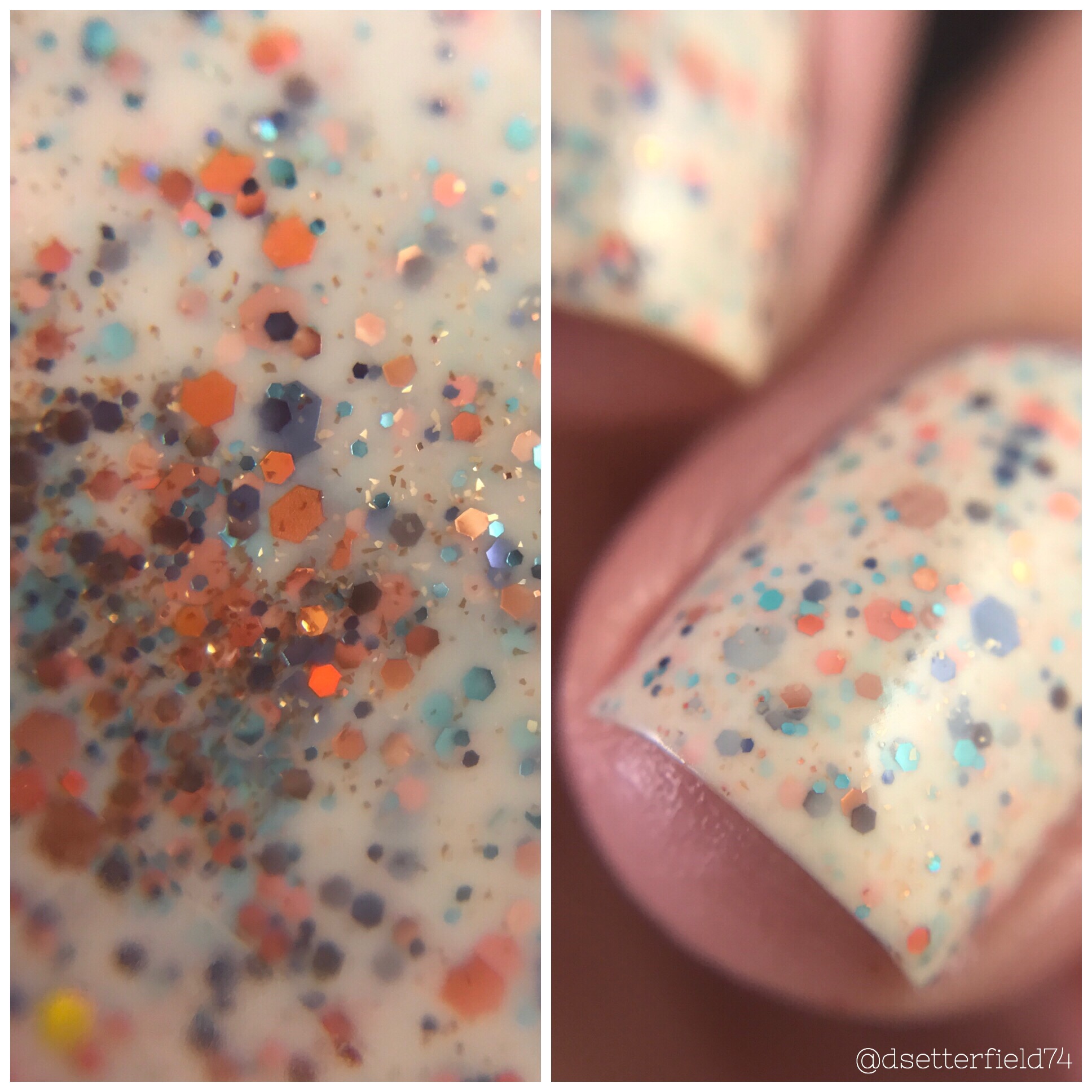 DESCRIPTION: A cream crelly with orange, turquoise, navy, bronze and copper glitters as well as a touch of copper shimmer