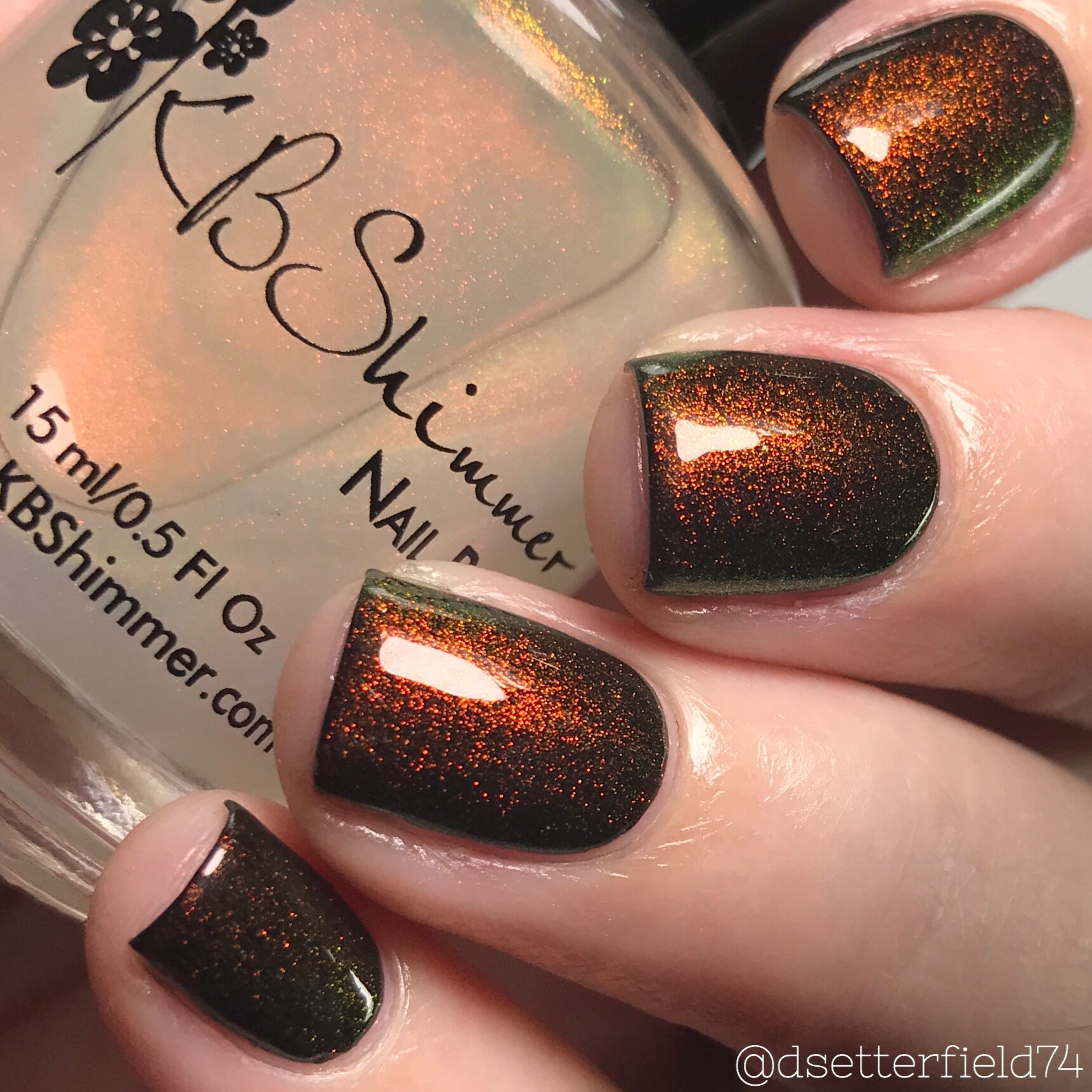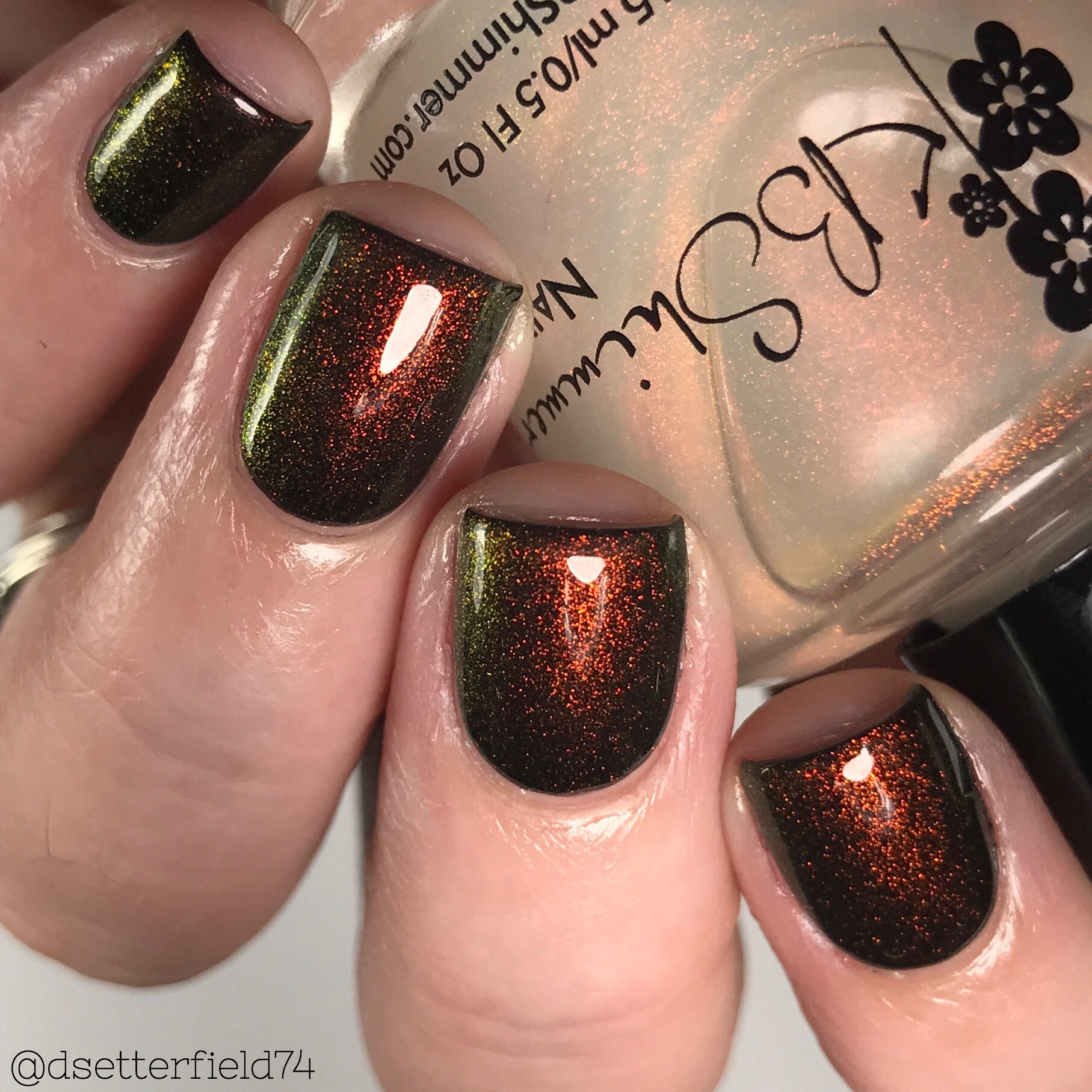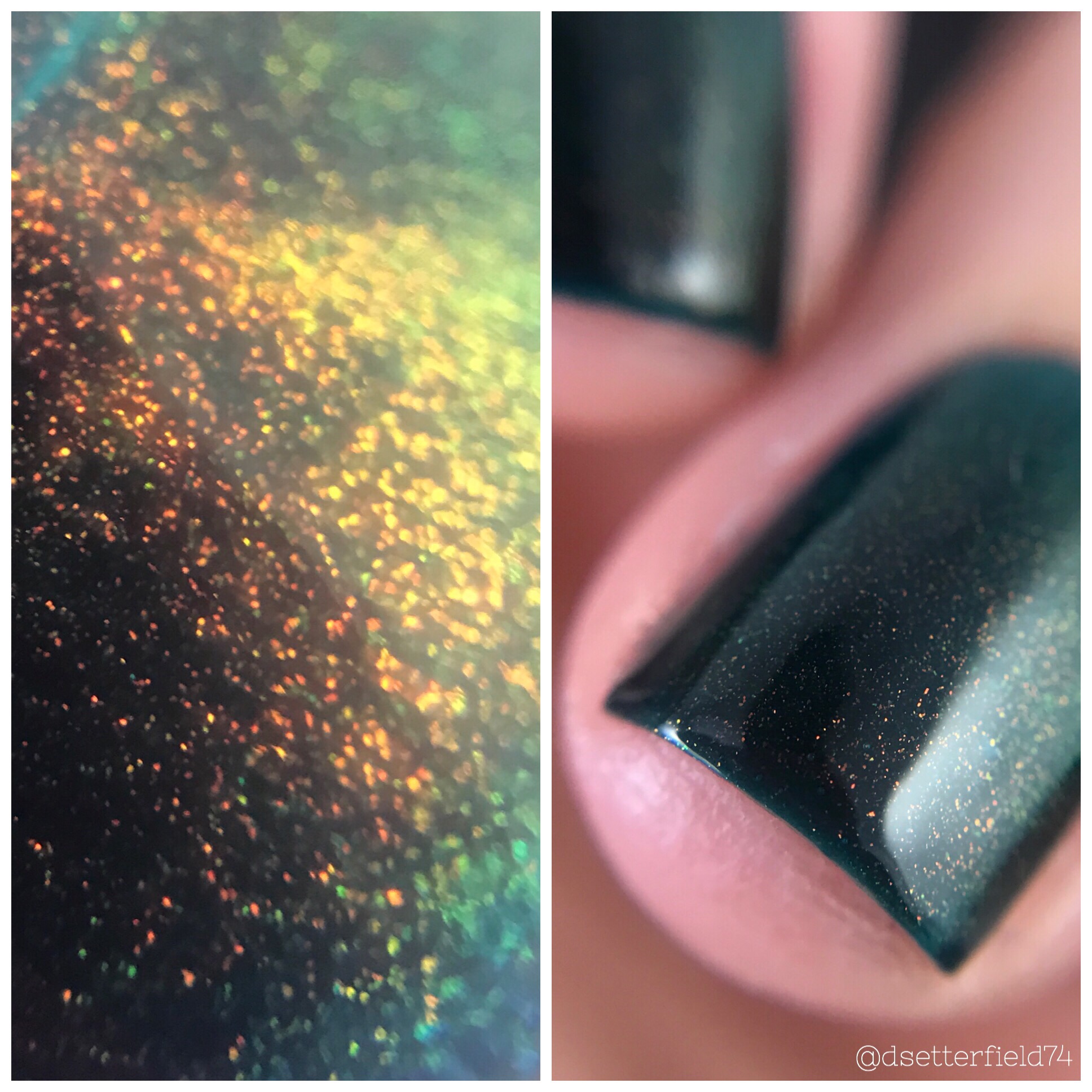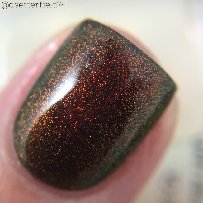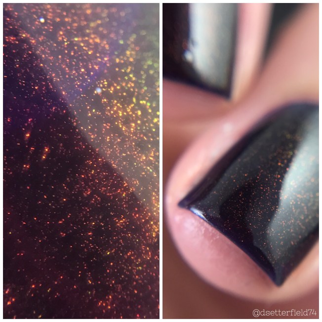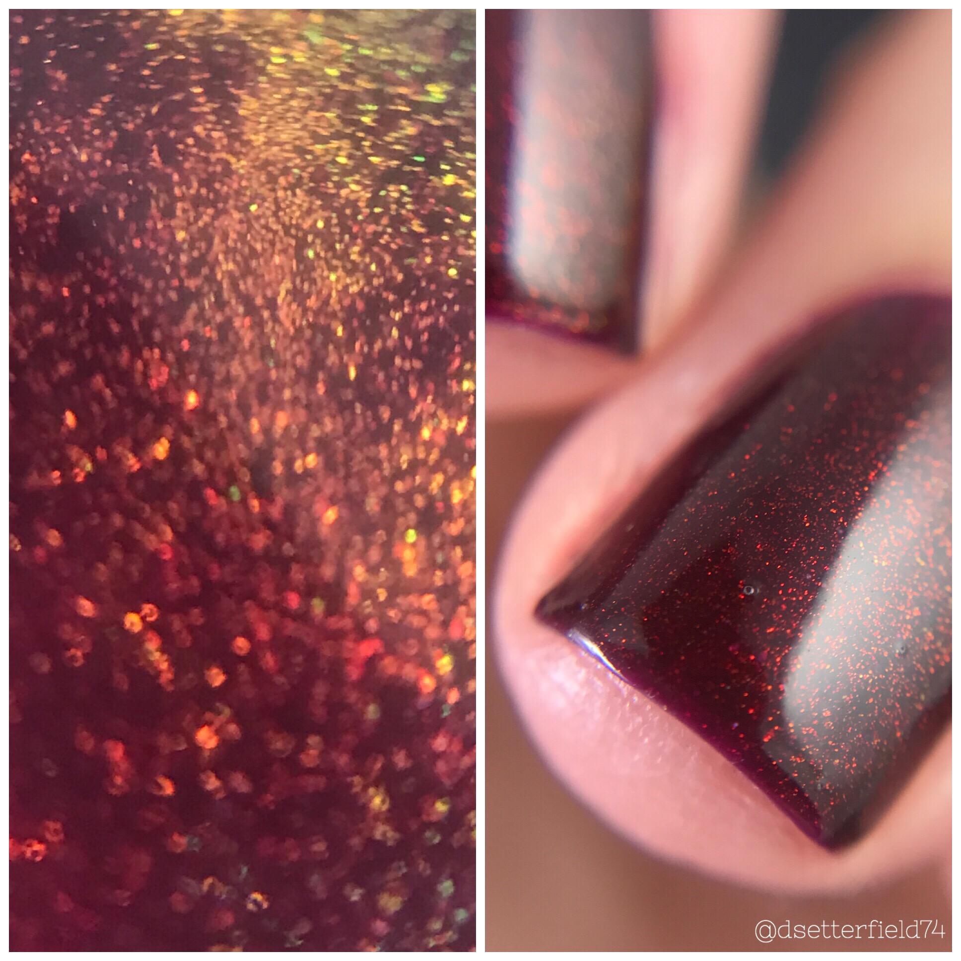 DESCRIPTION:  A fiery copper red shimmery topper that shifts orange/green/gold depending on the angle; layered over black for this swatch