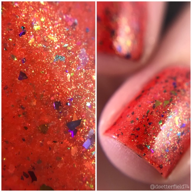 DESCRIPTION: An orange-red jelly with green/indigo shifting shimmer and purple, green, copper, gold, red and fuchsia ultra chrome flakies