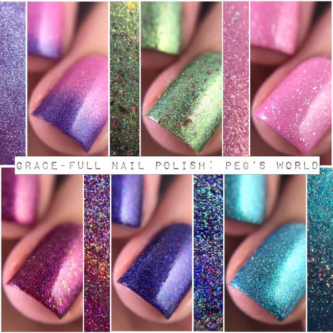 This is the Peg’s World Collection, a set of six holographic polishes inspired by Peg, the Grace-Full Nail Polish mascot featured on their thank you cards, business cards, etc. Each polish has a little special something added – like flakies and MAGIC – and officially you want like 18,000 bottles.