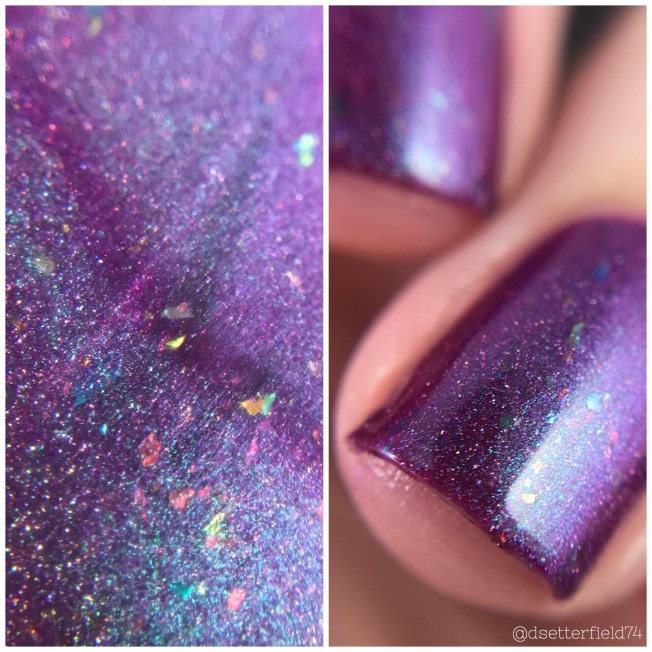 DESCRIPTION: A deep berry purple with a shifting green/blue/red shimmer, holographic pigment and gold/red/green flakies