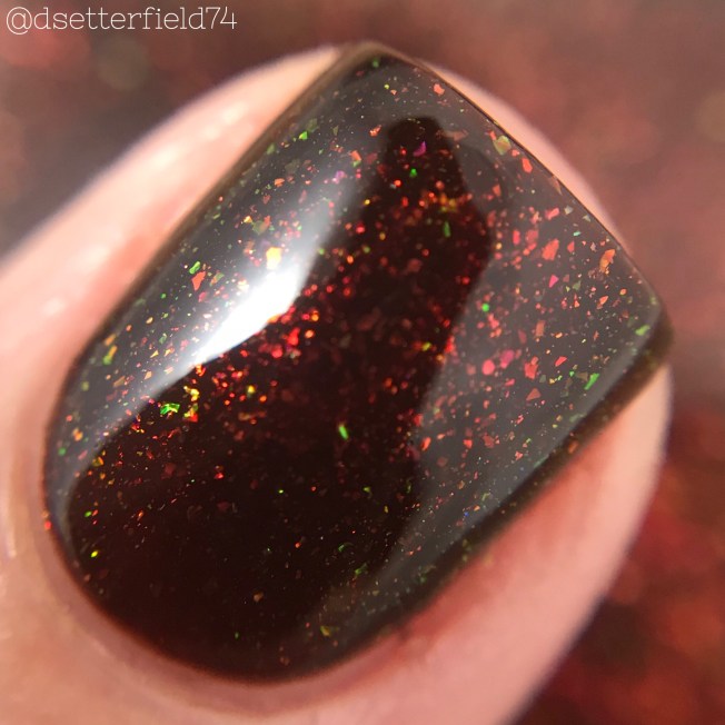 DESCRIPTION: A black/grey jelly base with a strong red-orange/gold/green shifting shimmer, linear holographic and red/orange/gold shifting flakies