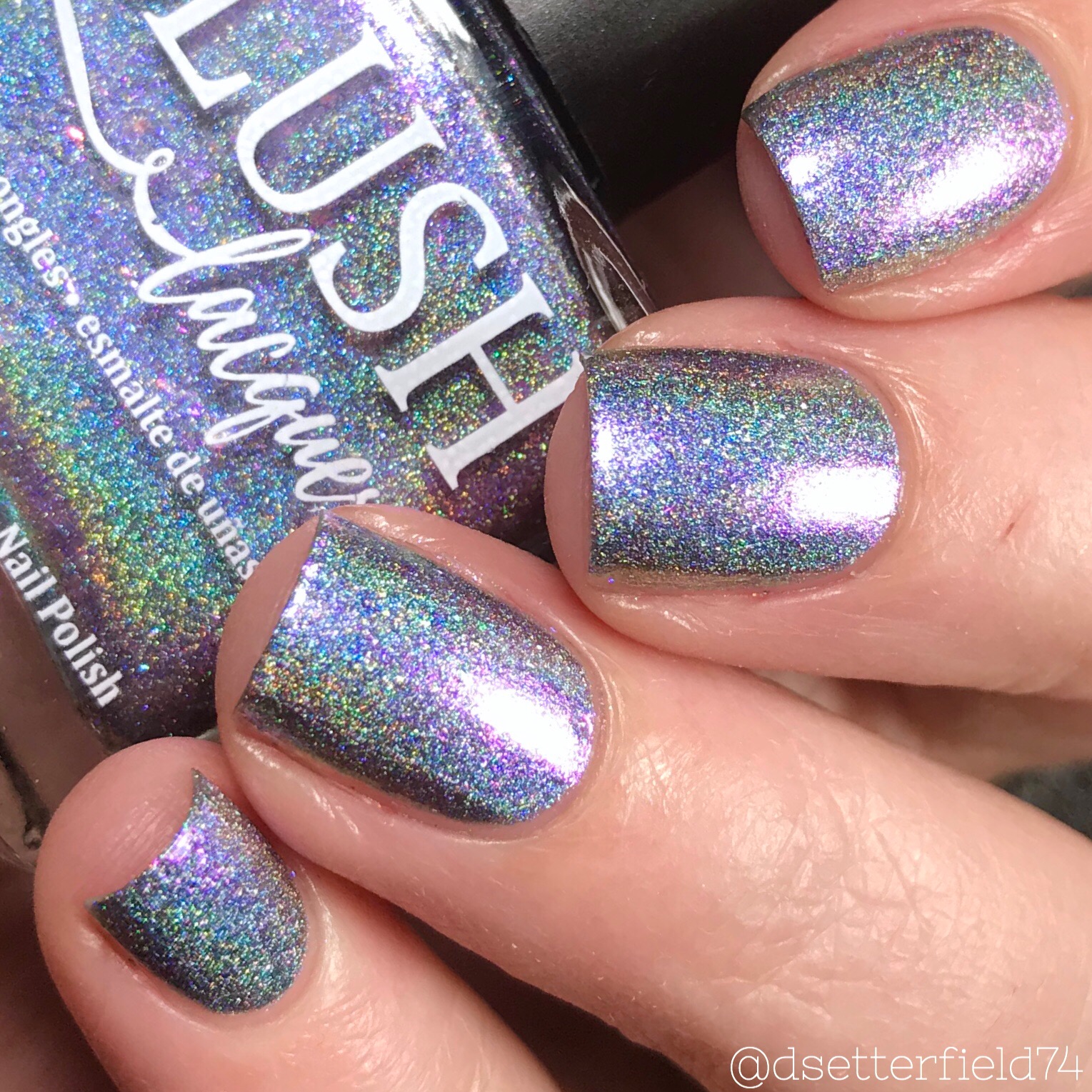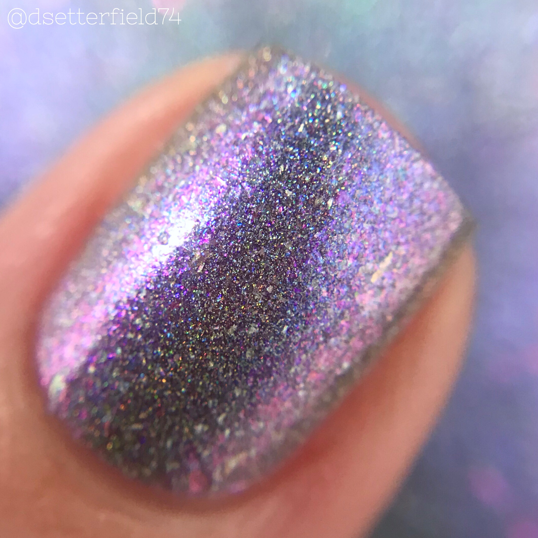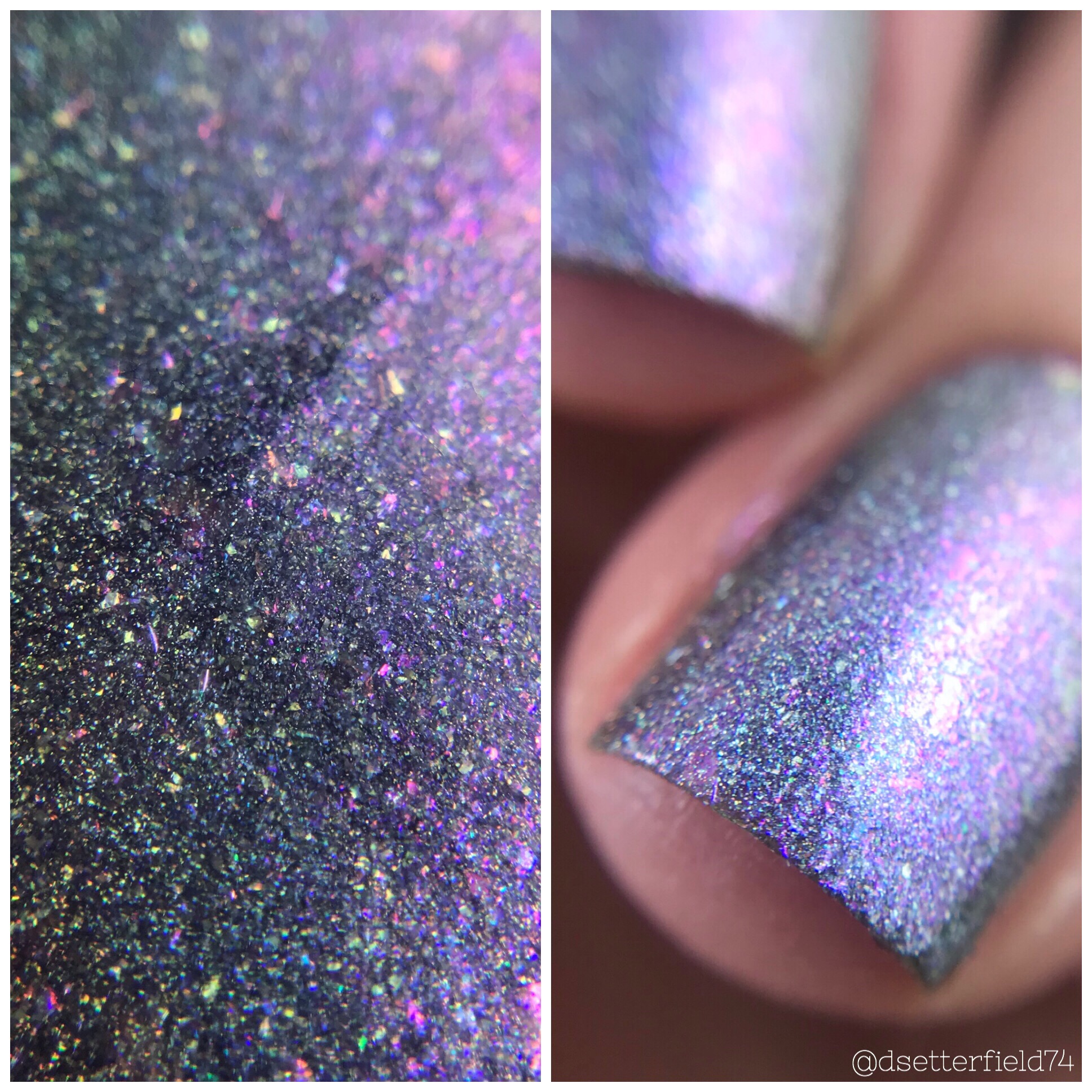 DESCRIPTION: An icy silvery-blue holographic with blue/purple/pink shifting multichrome, holo flakies and iridescent purple/green/pink/gold flakies