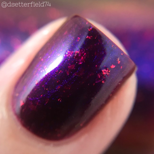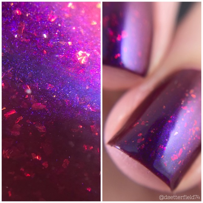 DESCRIPTION: A deep berry red with strong blue to vibrant red shifting multichrome glow with flaming orangey-red iridescent flakies that shift slightly green