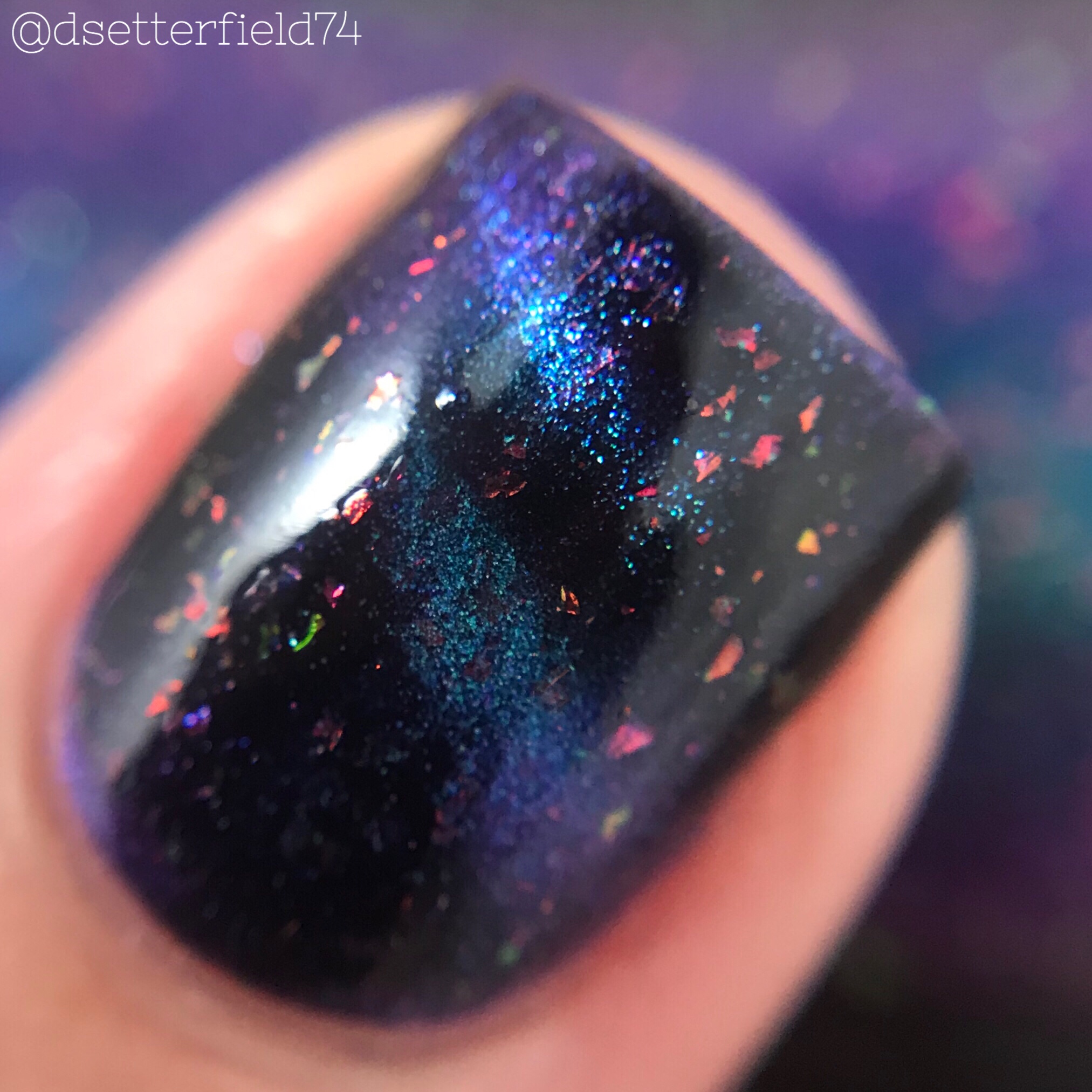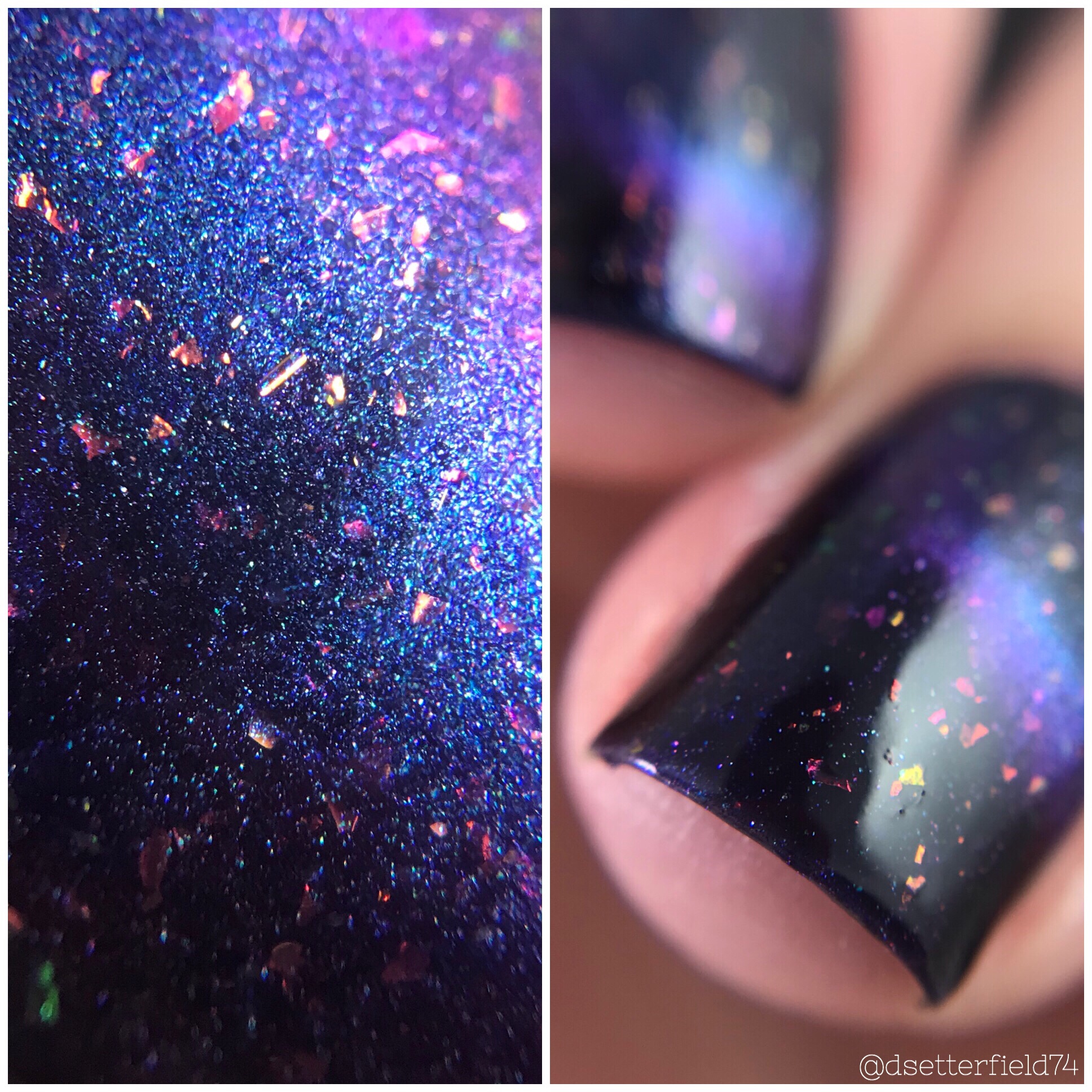 DESCRIPTION: A dark blue magnetic multichrome with green/purple shifting multichrome pigment and iridescent orangey/red flakies that shift green