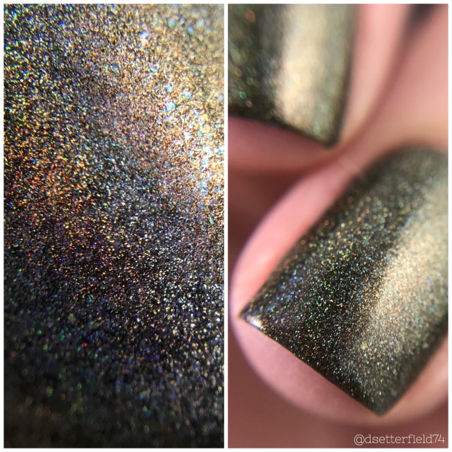DESCRIPTION: An olive green holographic with copper shimmer and light dusting of silver holographic microglitters