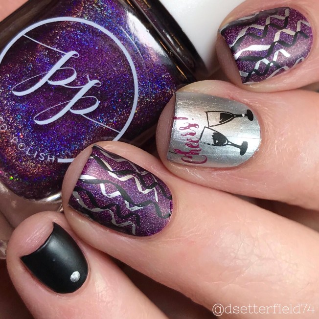 Okay. I kinda like this one. It’s not gonna win awards or anything, but it’s a pretty decent display of effort and worth half a horn toot at least. I paired it with Calming Ones Chakras, one of Jill’s older cremes from last year, and then stamped on some vines using the Uber Chic Beauty Lovely Leaves 2 plate. VINES, y’all. As in wine vines. Suddenly this blog’s gotten very very clever.