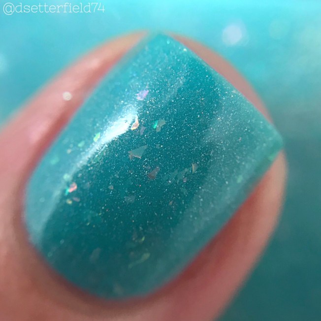DESCRIPTION: A bright, almost neon turquoise creme with holo sparkle and tons of teal/orange/pink color shifting flakies