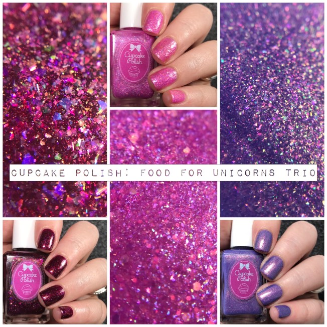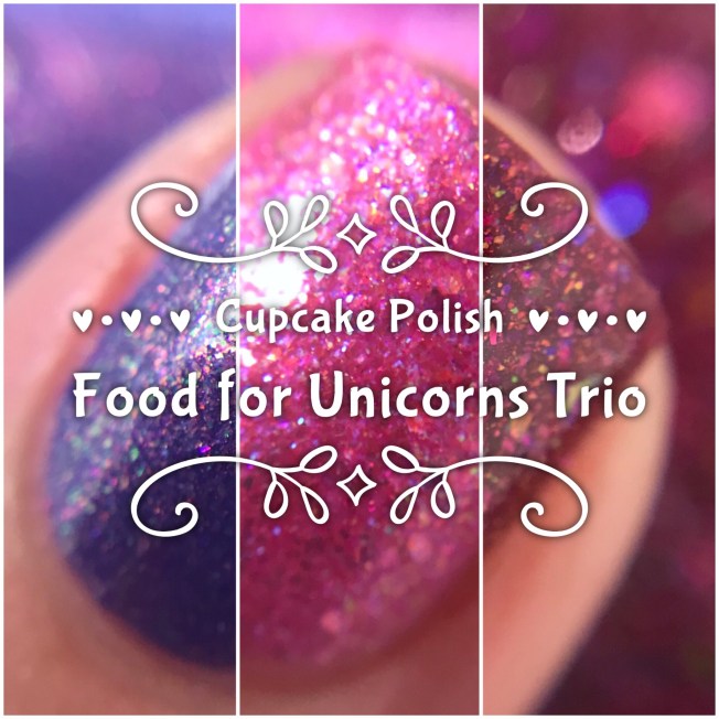 This is the Food for Unicorns trio from Cupcake Polish and it’s completely packed with shimmer and iridescence and general yummy deliciousness. Regardless whether you’re first or second out of bed, vom or no vom, your day just got a trillion times more better. A sparkly EXTRAVAGANZA starts now! Get to scrollin’ boo boos …