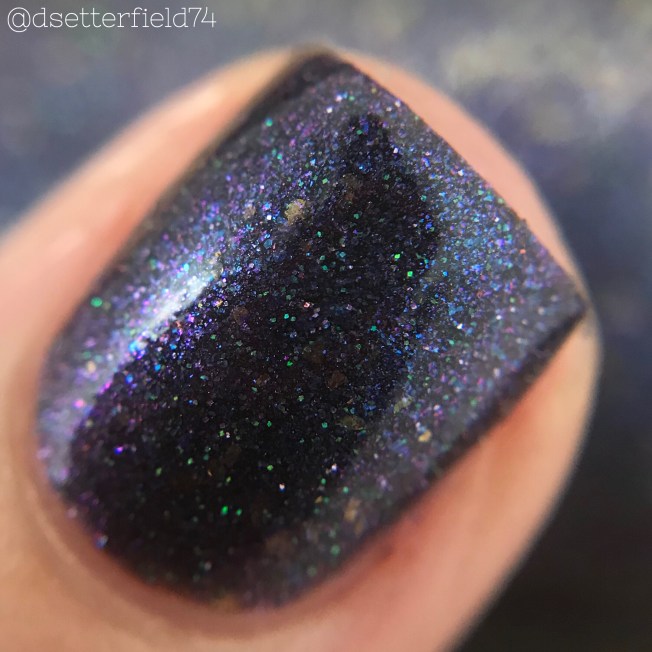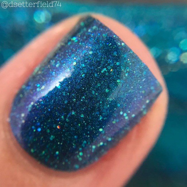 DESCRIPTION:  A blue base with a dark purple to teal shifting chromatic flame and finished with scattered holo pigment