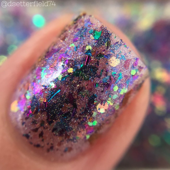 DESCRIPTION:  A mix of multiple colors of ultra chrome chameleon flakies, linear holographic pigment and multiple sizes of color shifting chameleon hex glitter finished with a purple-based shimmer that can also shift blue