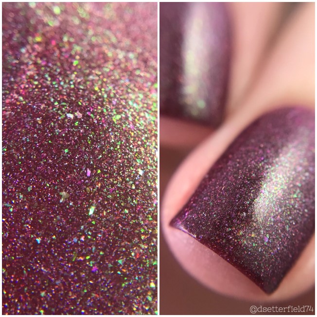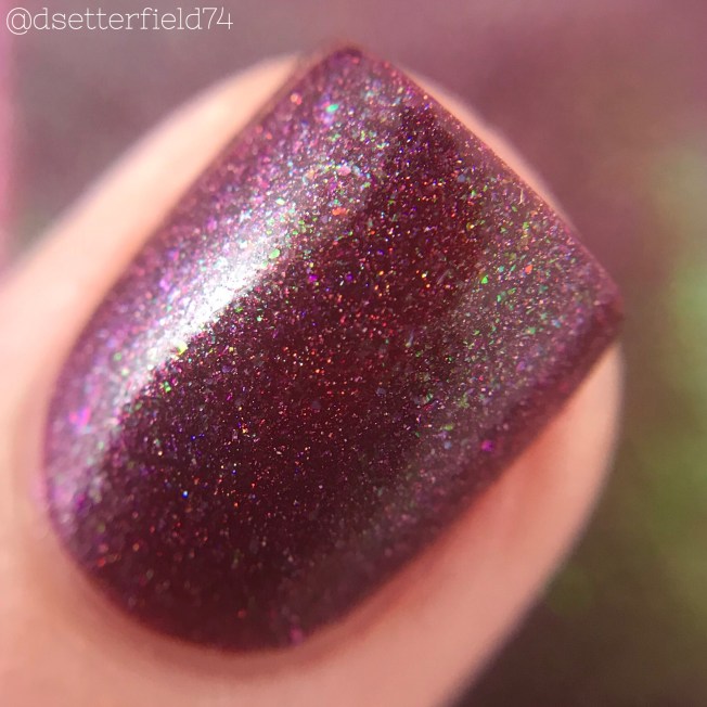 DESCRIPTION:  A dark burgundy/maroon base with green/pink shifting shimmer and scattered holo pigment