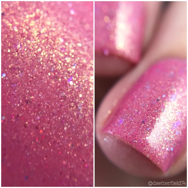 DESCRIPTION:  A bubblegum pink crelly with scattered holo pigment, strong green shimmer, lime iridescent micro shreds and iridescent crystal flakies