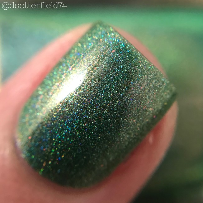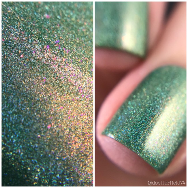 DESCRIPTION:  A deep mint green holographic with peach shimmer and hot pink sparkle