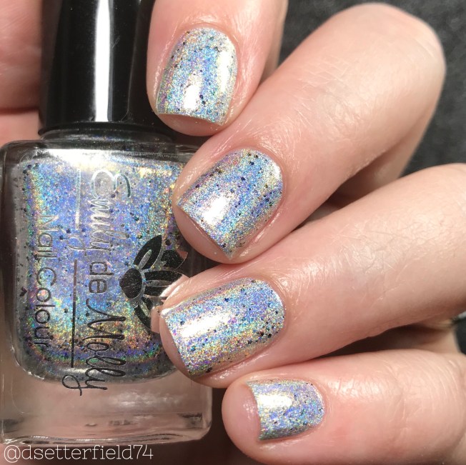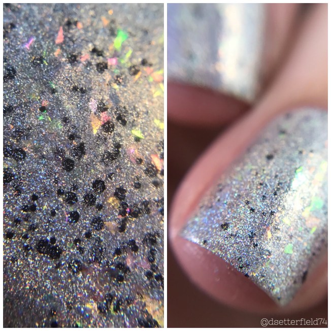 DESCRIPTION: A silver holographic with gold/pink/green iridescent flakies and black microglitters