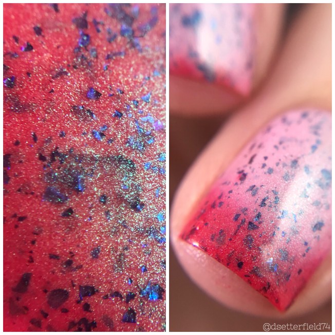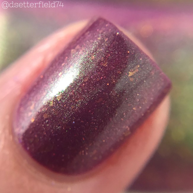 DESCRIPTION: A red based plum with green to pink shifting shimmer, copper microglitter and gold flakies
