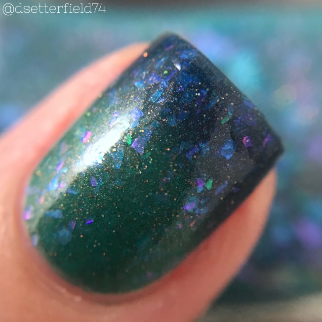 DESCRIPTION: A dark teal blue to light teal green thermal with copper shimmer and green/purple iridescent flakies