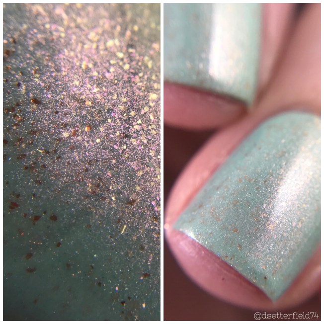 DESCRIPTION: A mint base with soft copper/bronze/gold shifting shimmer, bronze micro flakies and a touch of scattered holo
