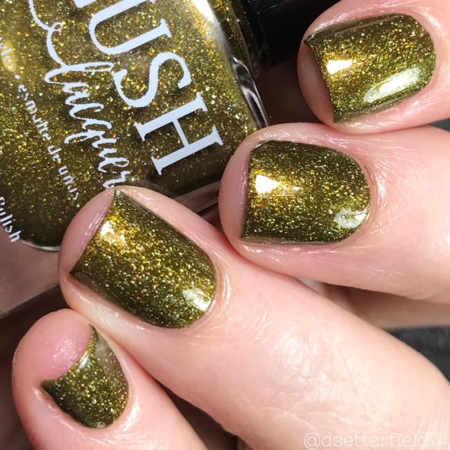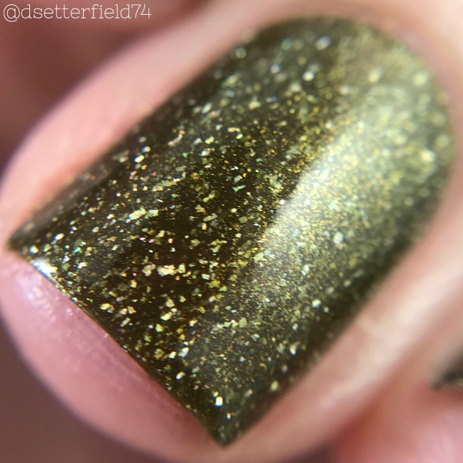 DESCRIPTION: A deep olive base with brown tones, golden green shimmer and holographic flakies